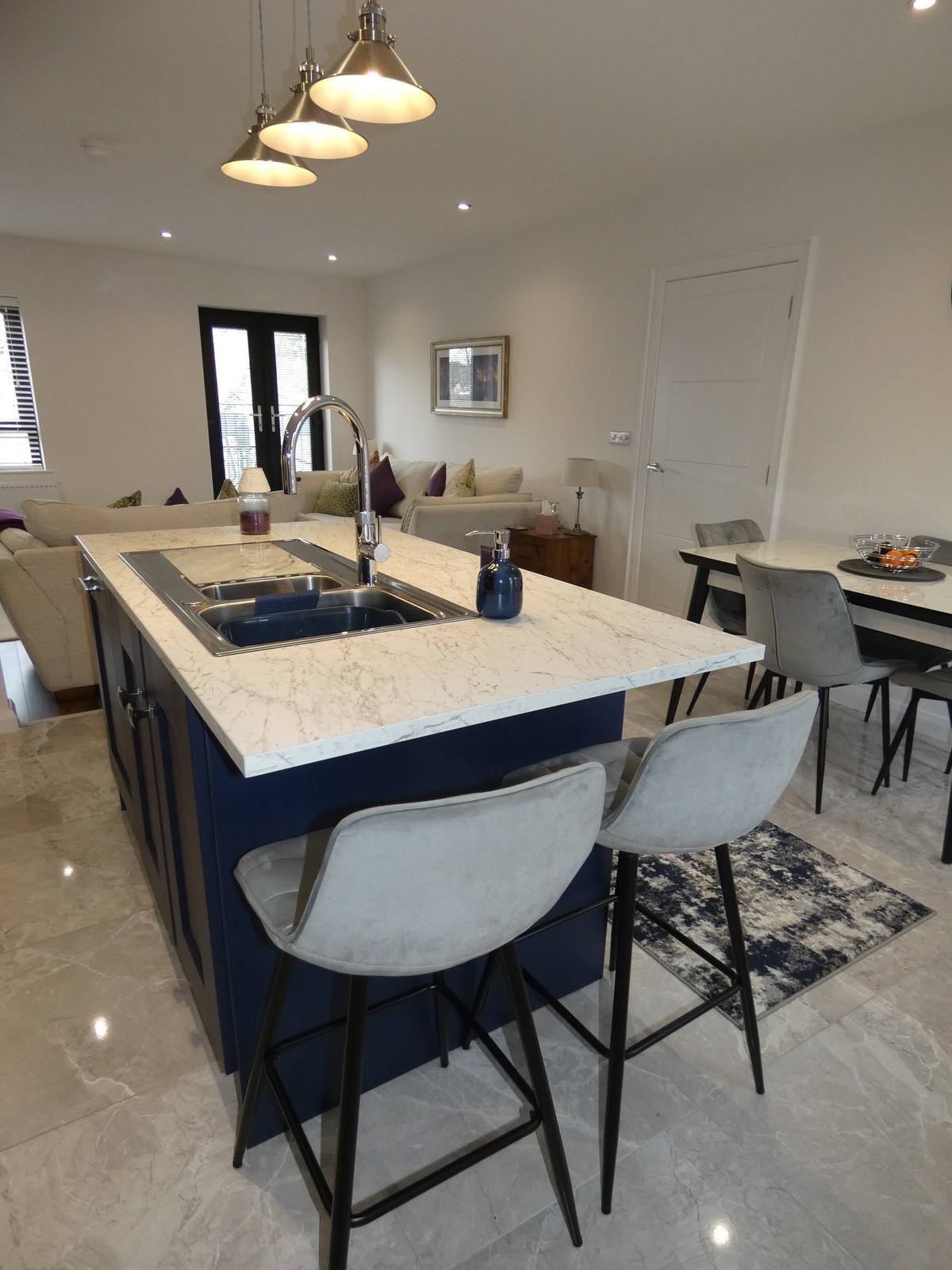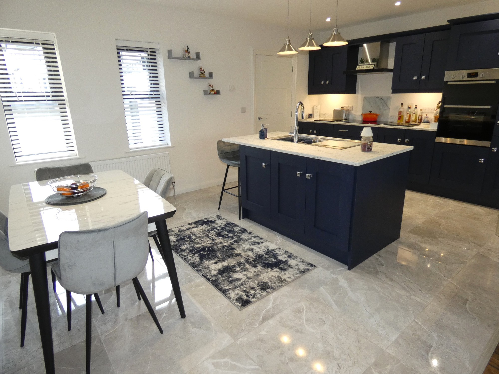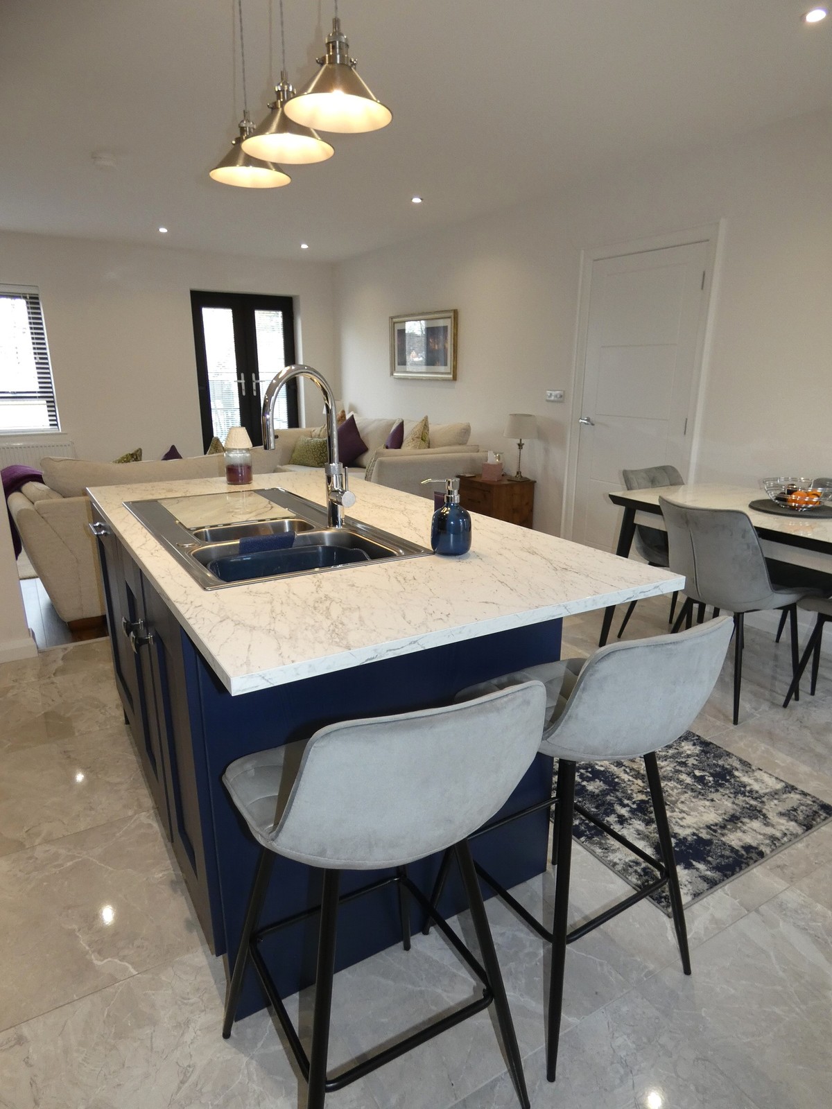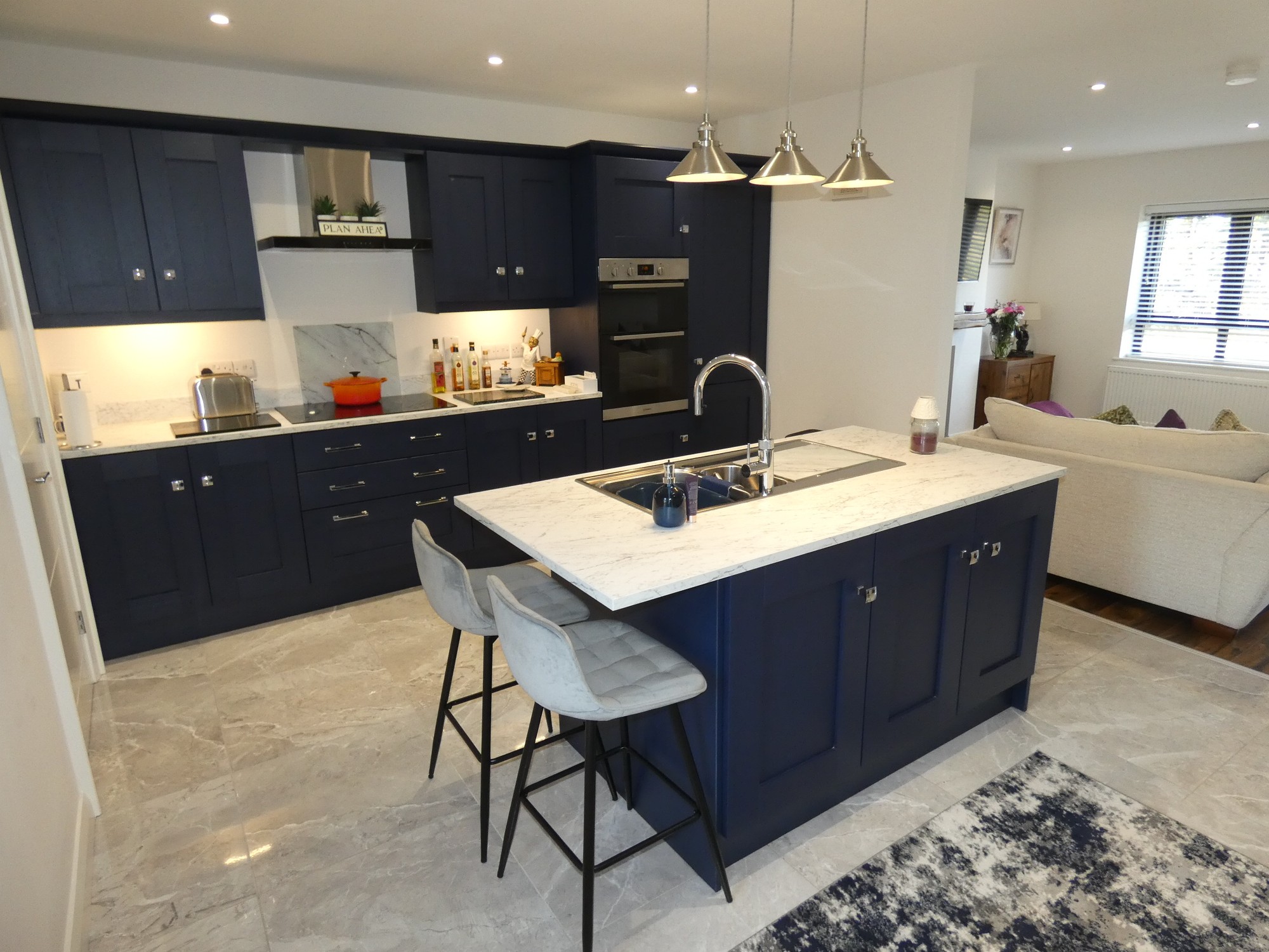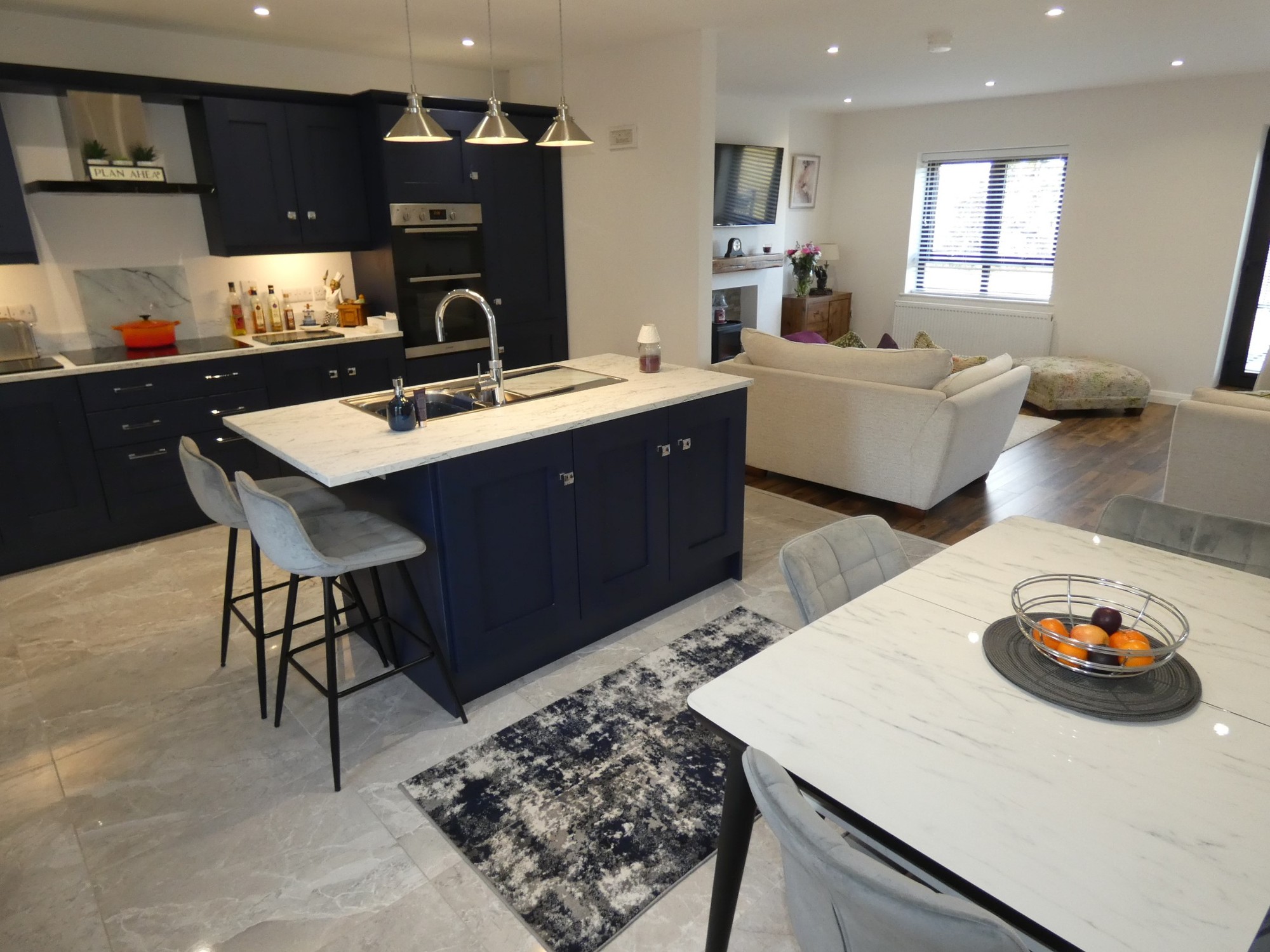 A fantastic kitchen with an extensive range of fitted units, worktop with a matching upstand splashback, Indesit induction ceramic hob (touch controls) with a touch control extractor fan over, eye level double oven, integrated fridge/freezer (self-defrosting), integrated dishwasher, island unit/breakfast bar with a bowl and a half stainless steel sink unit and a "Quooker" hot water tap, power points, separate shelved larder unit, concealed display lighting, contemporary tiled flooring, recessed ceiling spotlights; and open plan to the lounge.