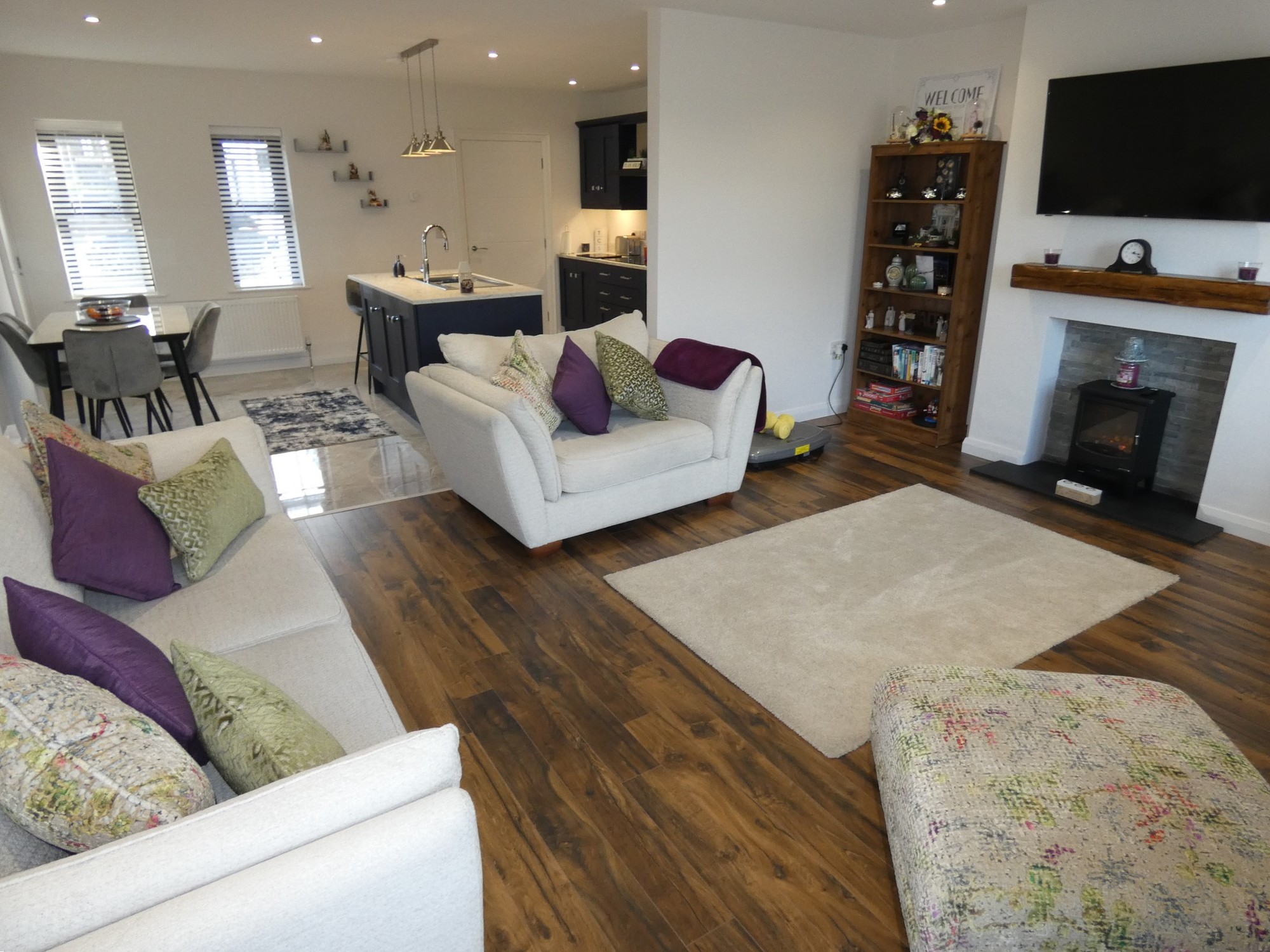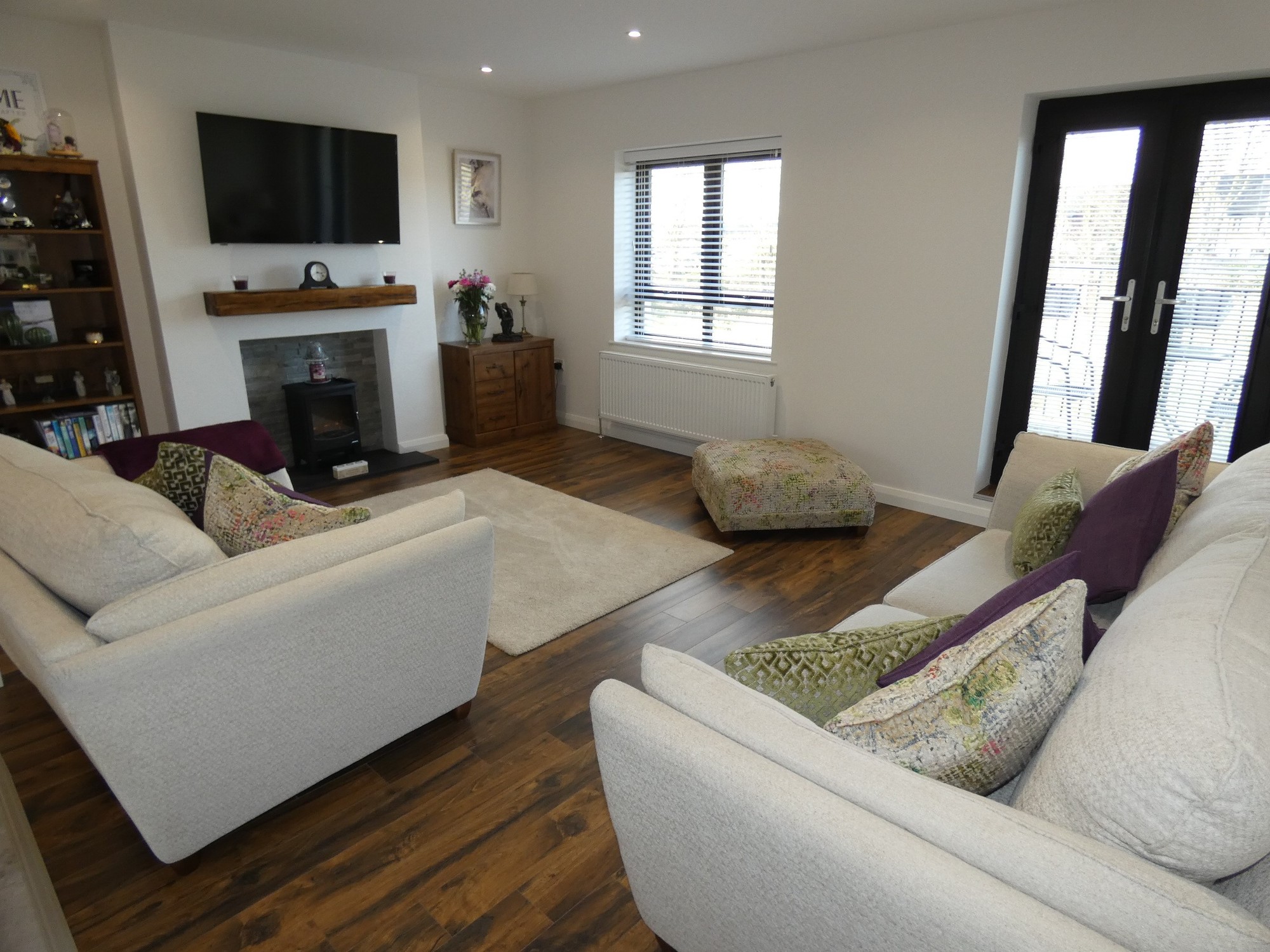 Open plan from the kitchen with a feature electric stove including a feature stone clad background and a beam mantel unit, high level T.V. point, attractive wooden flooring, recessed ceiling lights spotlights and french doors to a delightful balcony to the front.