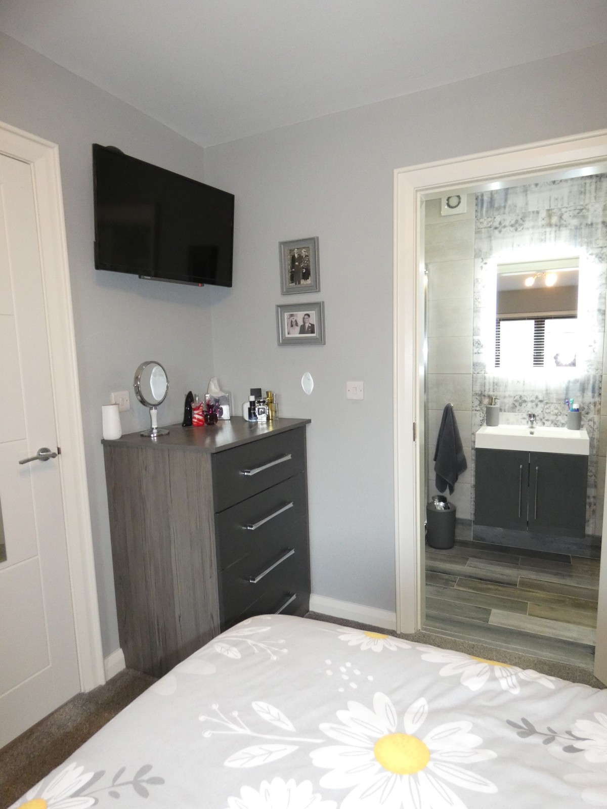 A super master suite with an extensive range of fitted bedroom furniture including wardrobes, overhead storage, drawers, high level T.V. point and a luxurious ensuite comprising a vanity unit with storage below, fully tiled walls, tiled floor, heated towel rail, 2x extractor fans, fitted mirror with LED lights, recessed ceiling spotlights, and a large tiled shower cubicle including a mixer shower with a drench head and a flexible hand shower attachment.