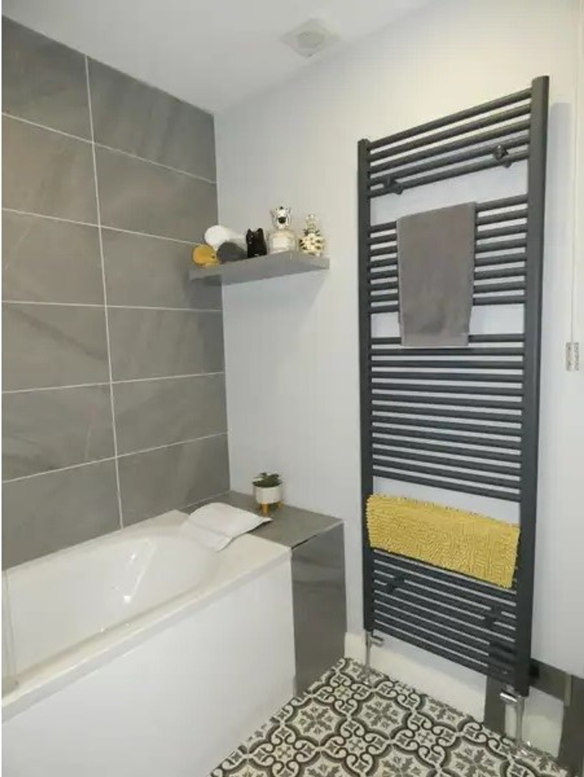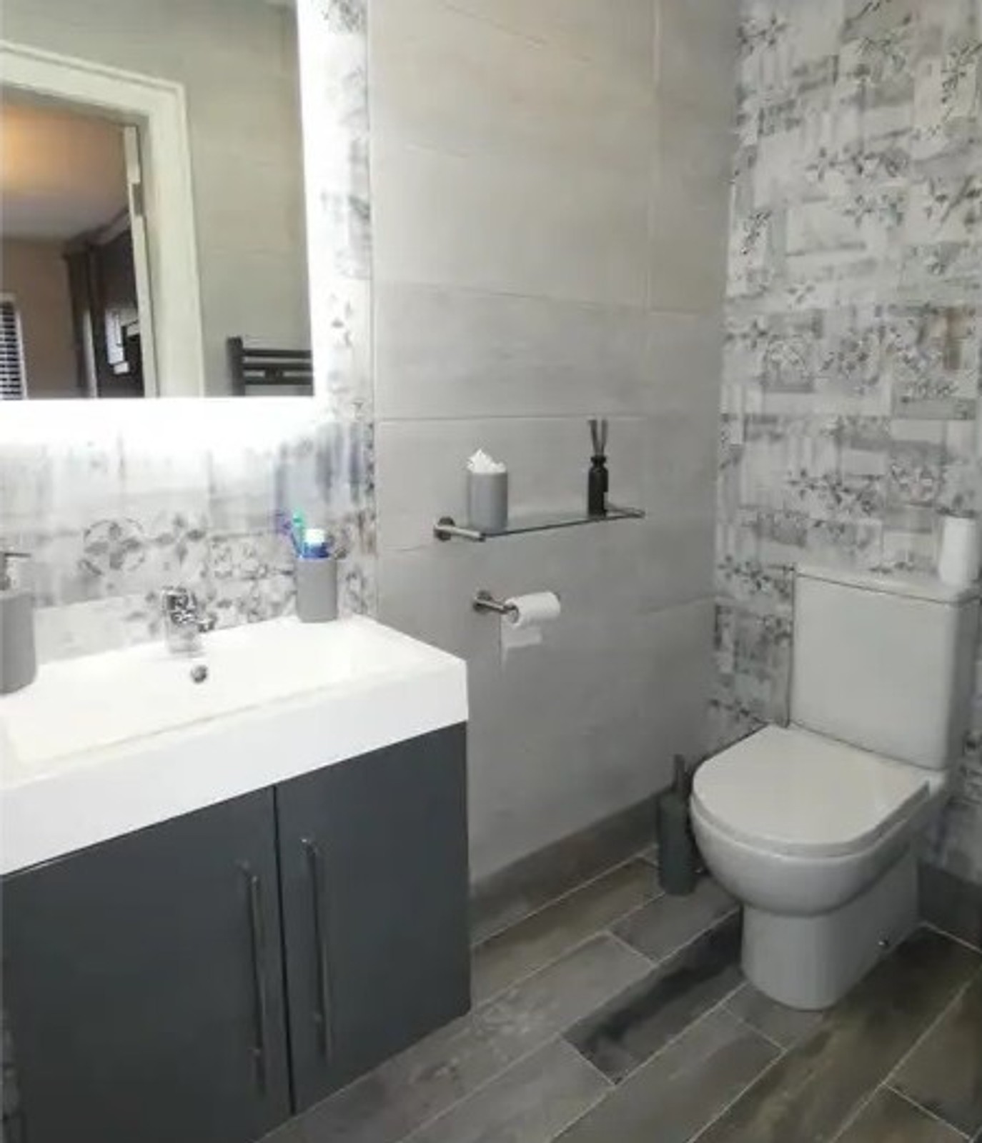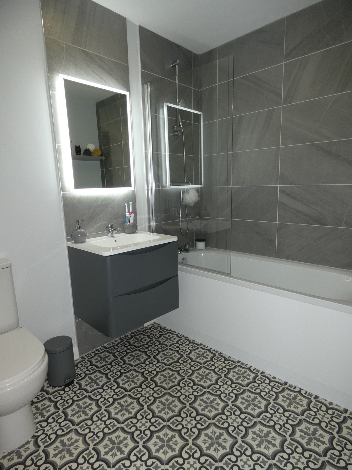 A luxurious family bathroom including a wall mounted vanity unit with storage below and a high level tiled splashback with an LED illuminated mirror, high level anthracite colour heated towel rail, wc, extractor fan, recessed ceiling spotlights and a panel bath with a tiled surround and a mains mixer shower over.