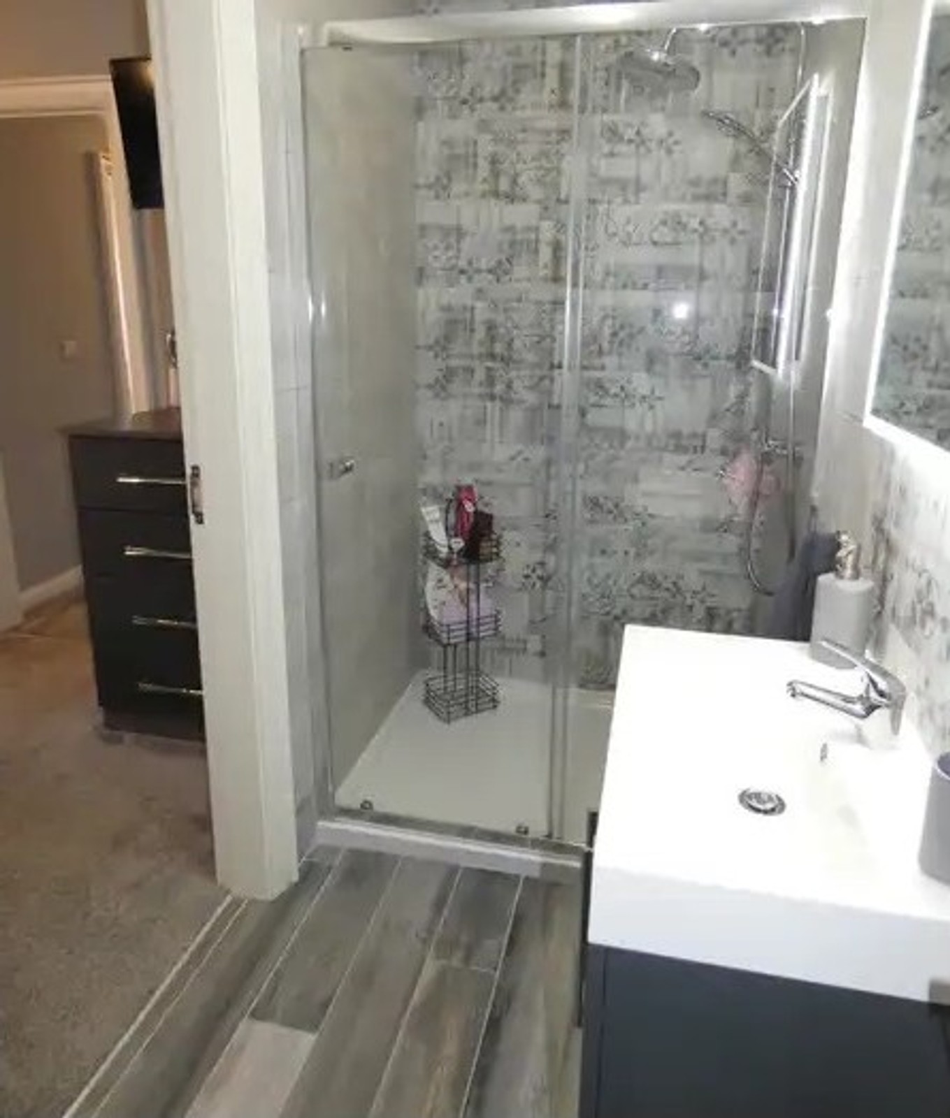 Contemporary fittings including a wall mounted wash hand basin, wc, attractive tiled flooring, extractor fan, recessed ceiling lights and a large tiled shower cubicle with a mains mixer shower.