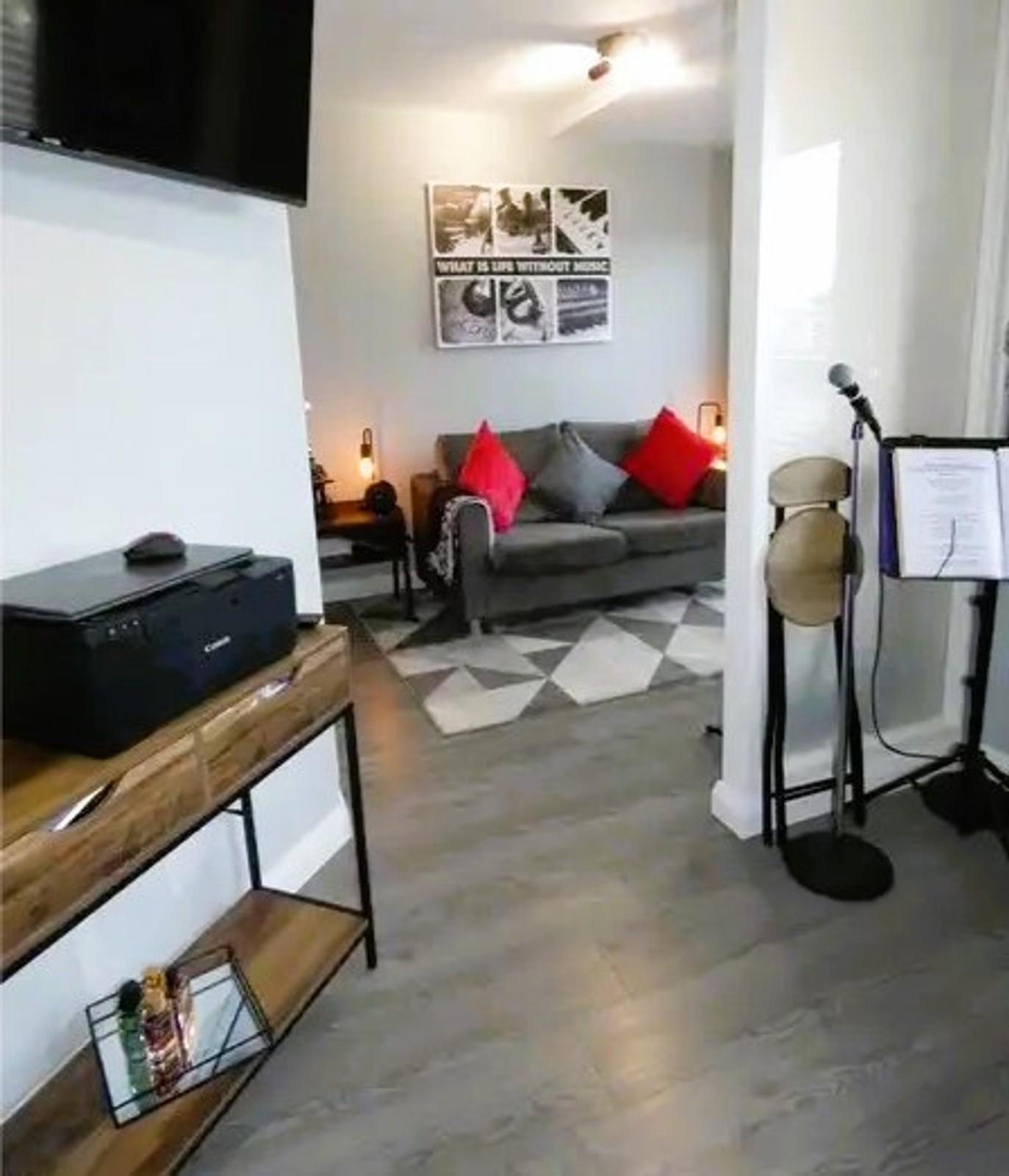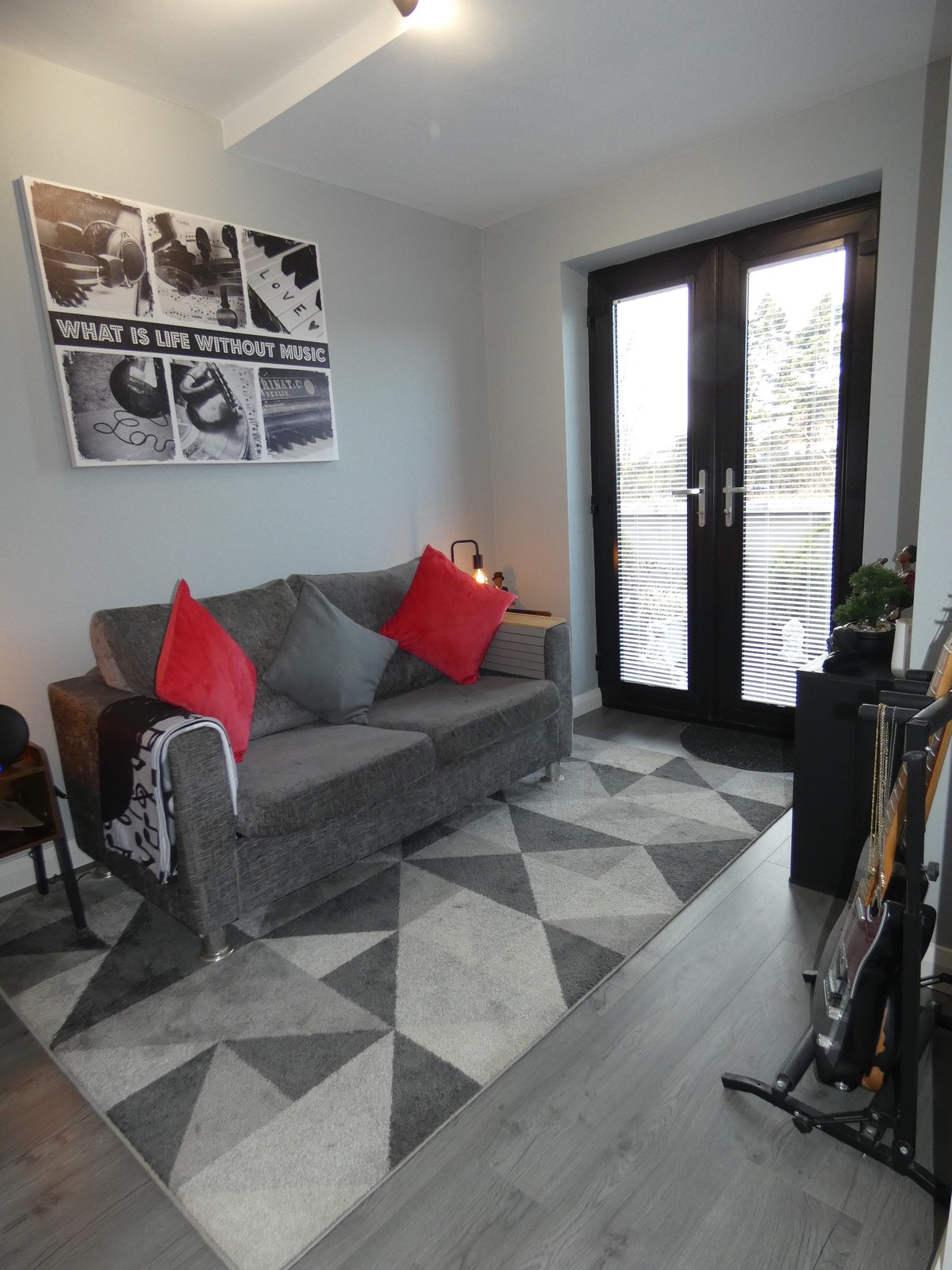 A fantastic second bedroom with wood flooring, T.V. point, dimmer switch and french doors to the landscaped and enclosed rear garden.