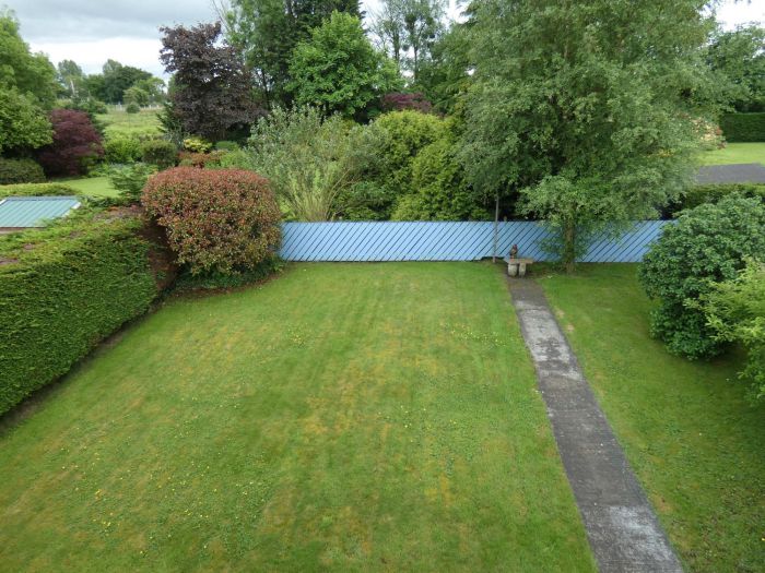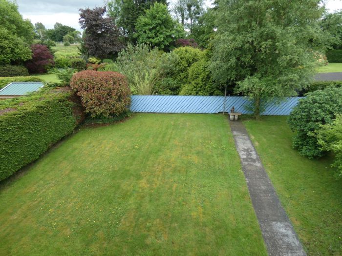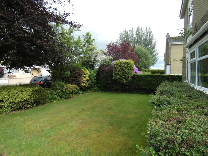Garden area in lawn to the front with mature shrubs and hedge boundaries.