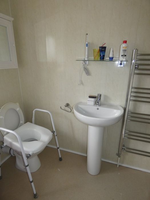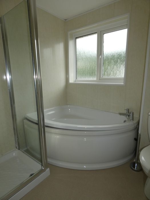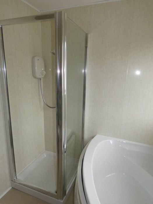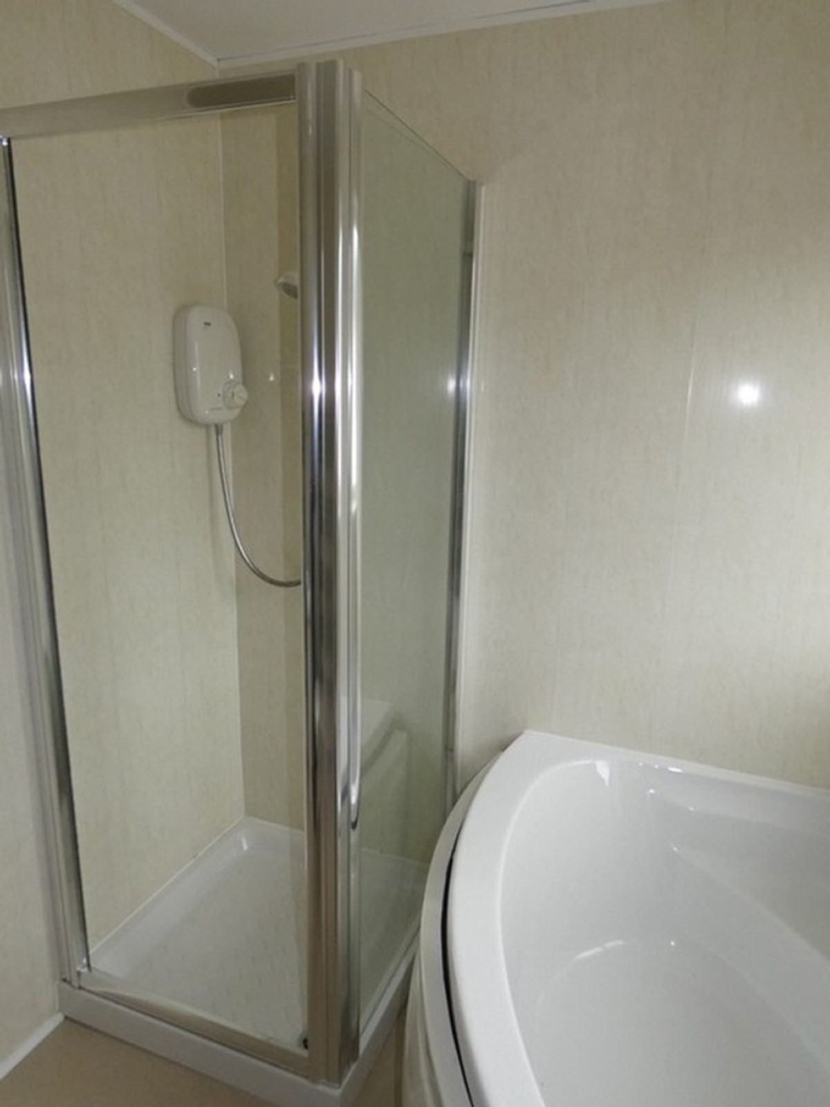 Including a wc, a pedestal wash hand basin, a corner bath, panelled walls, a heated towel rail and a panelled shower cubicle with a Mira electric shower.