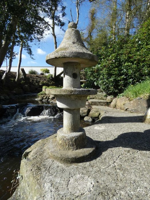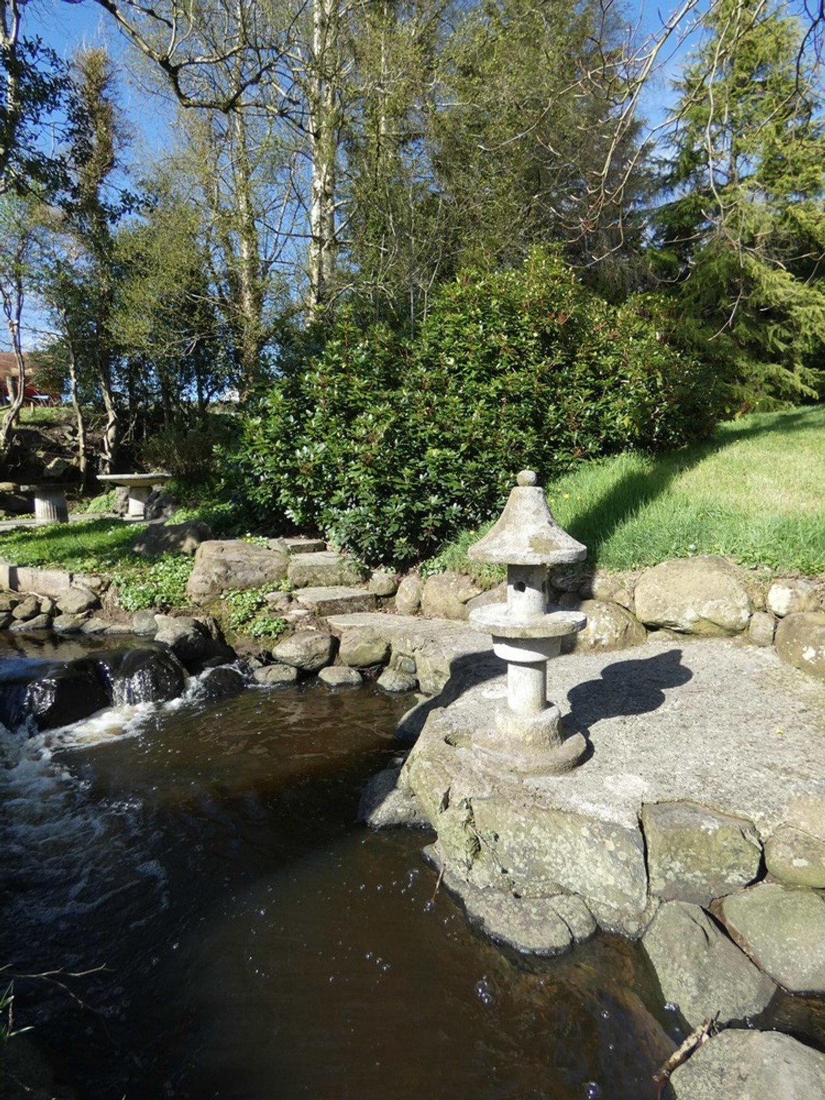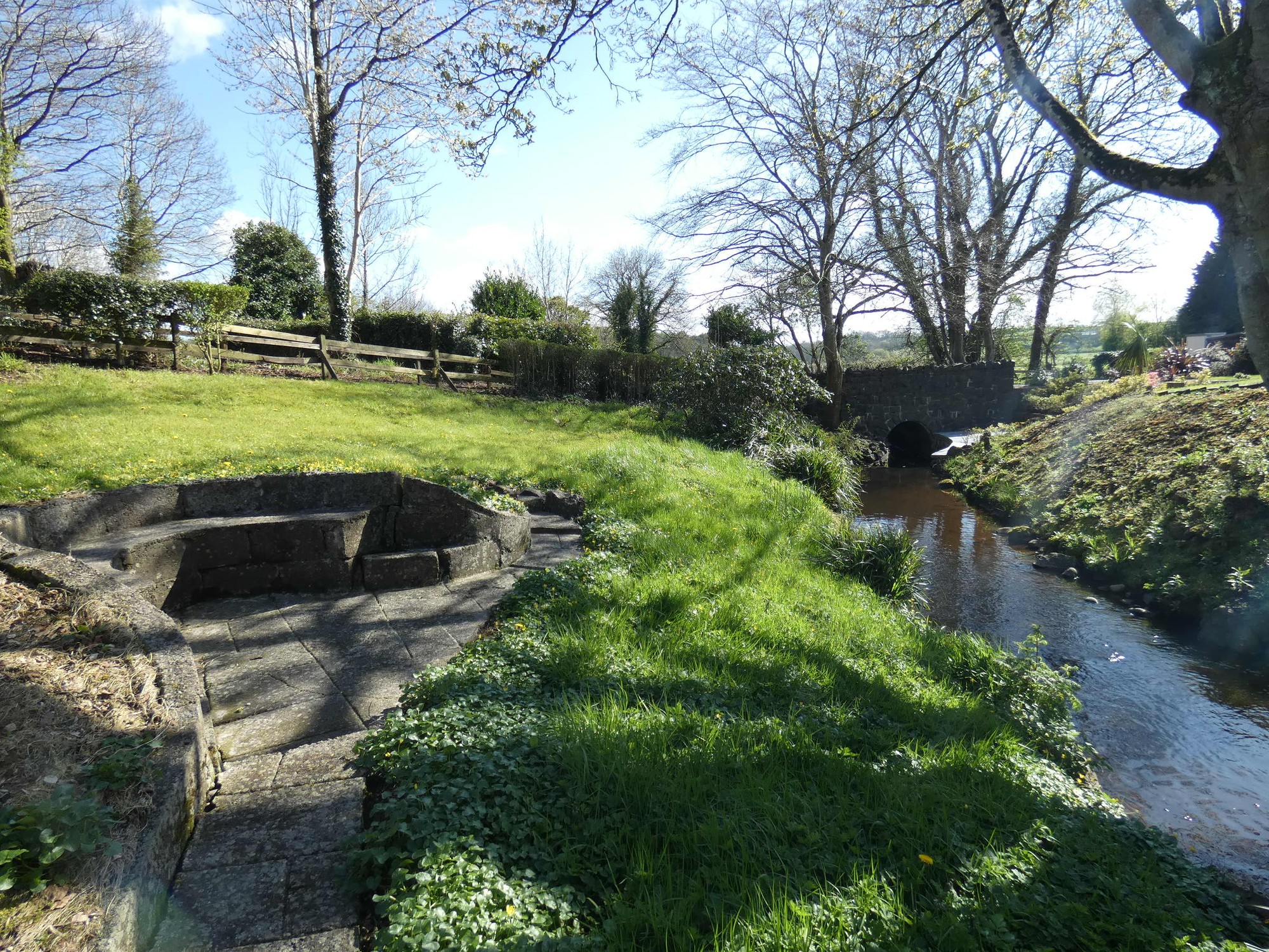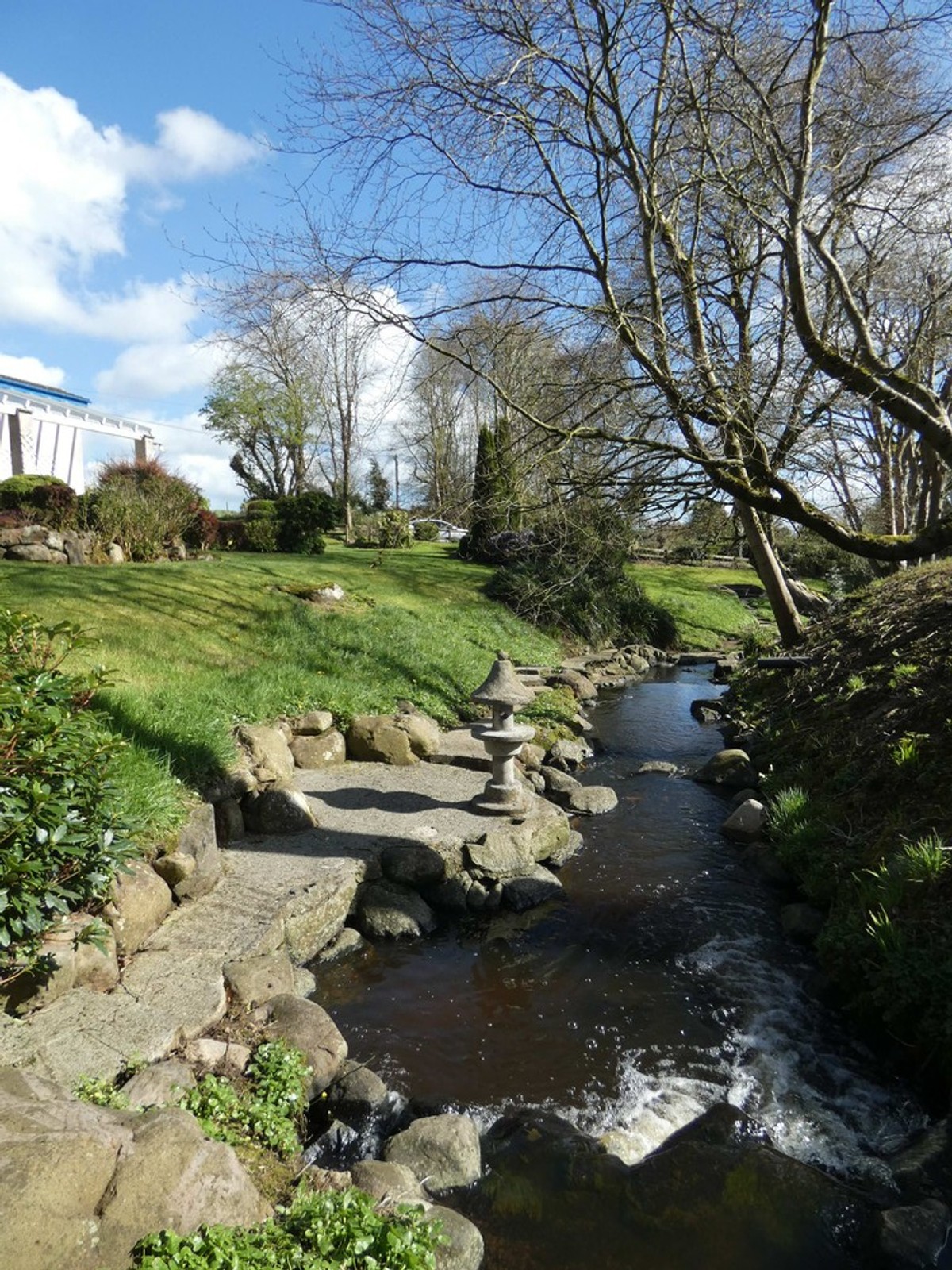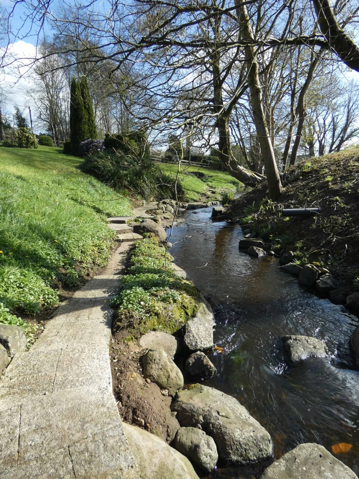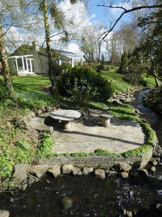 The stream itself makes a statement entrance to the gardens via a feature arched rustic bridge and lovely waterfall with stepping stones crossing the same.