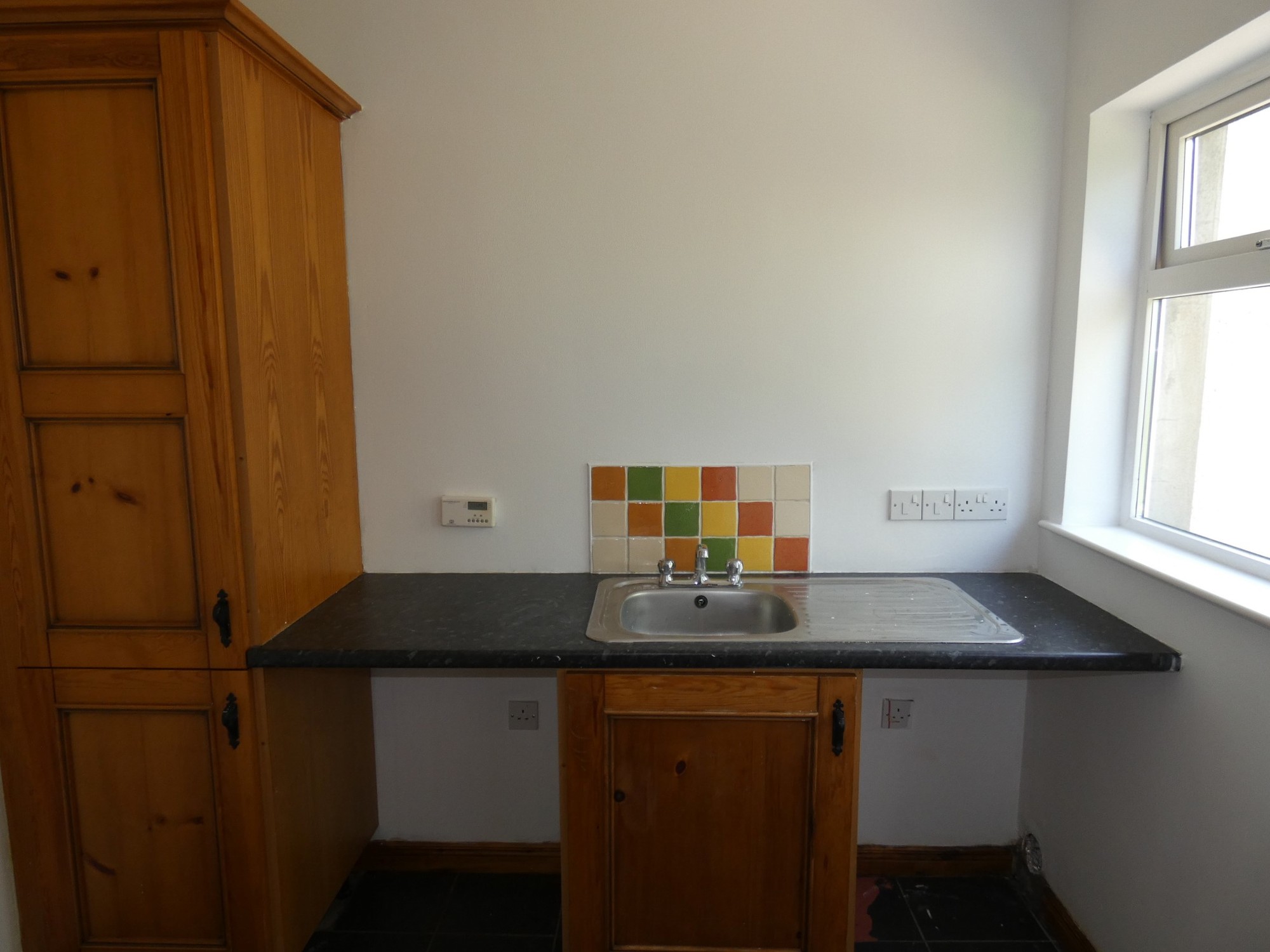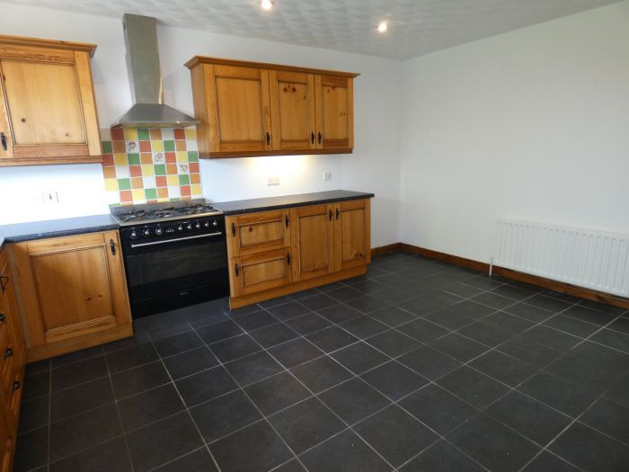 Fitted units including a larder unit/broom cupboard, stainless steel sink unit, plumbed for an automatic washing machine, space and vented for a tumble dryer, tiled floor and a partly glazed door to the rear.