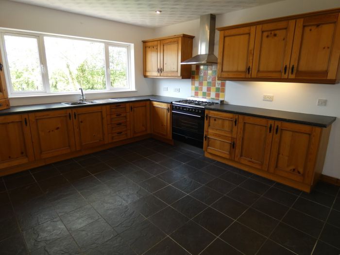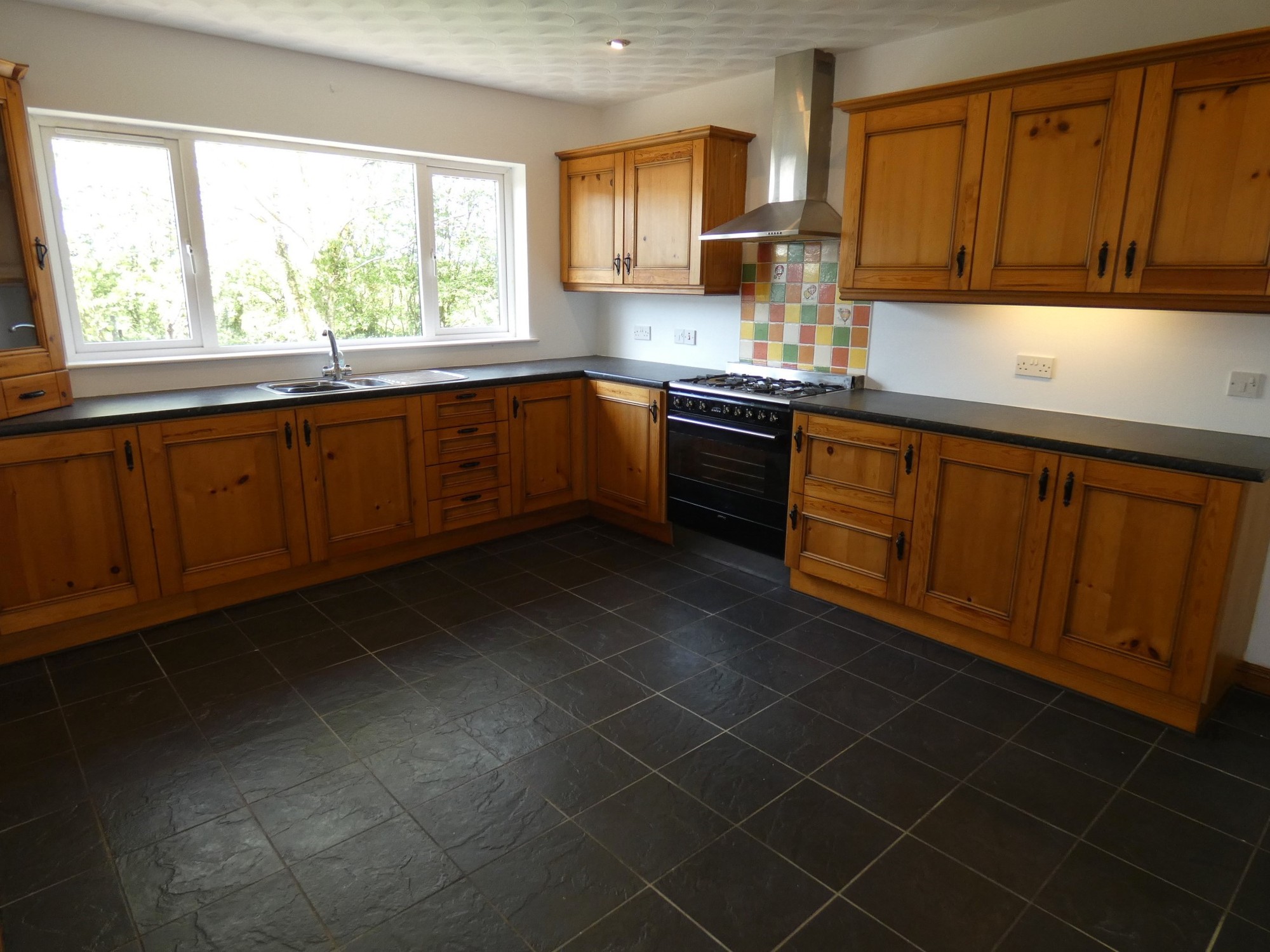 With a range of fitted eye and low level units, bowl and a half stainless steel sink unit, space for a range type cooker with a tiled splashback and a stainless steel extractor fan over, pan drawers, glass display unit, tiled floor, a door to the utility room and an outlook over the rear garden and surrounding countryside.