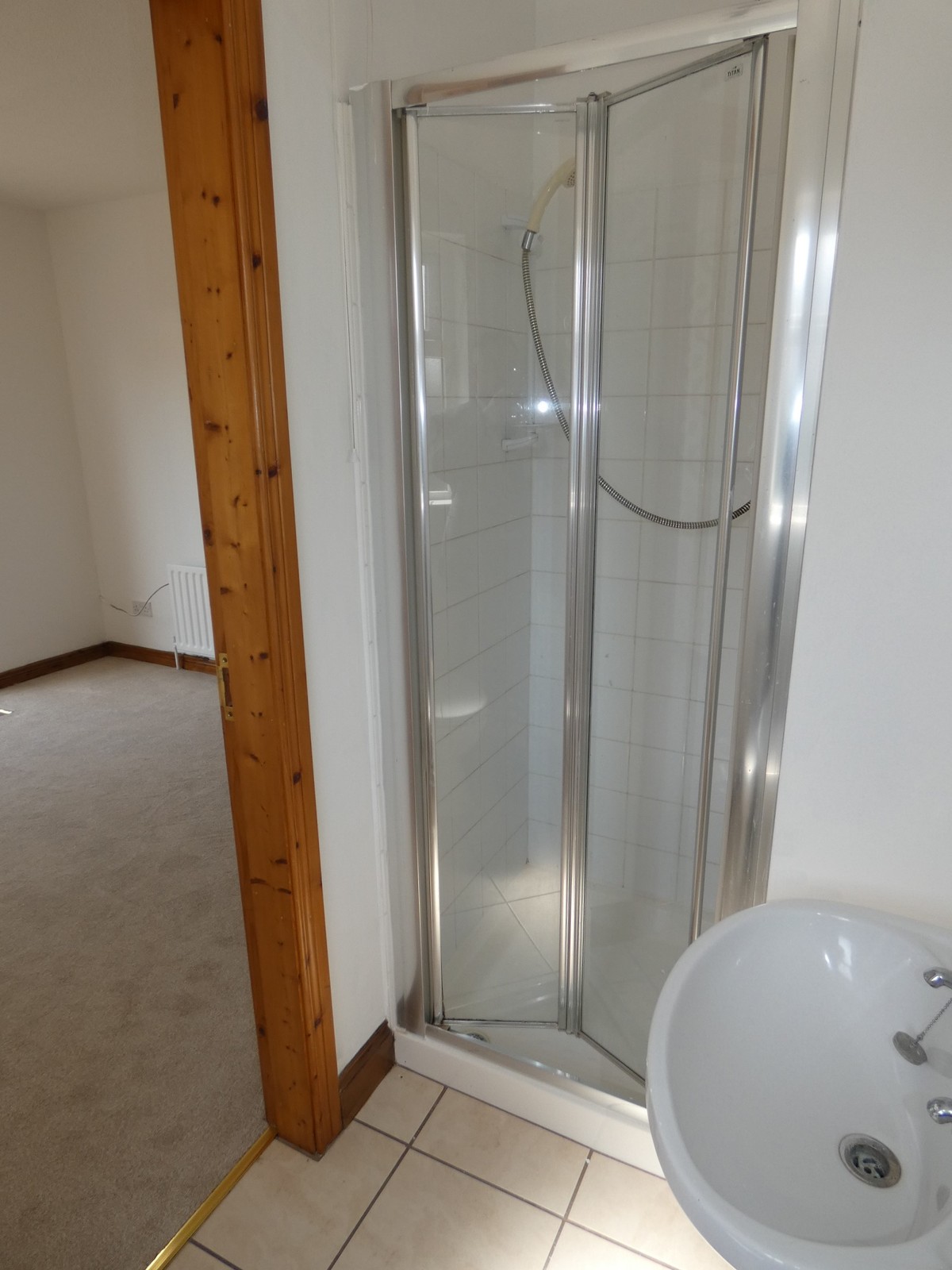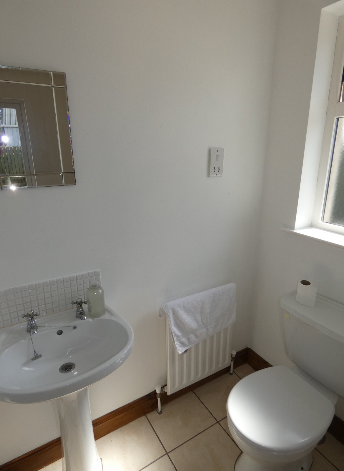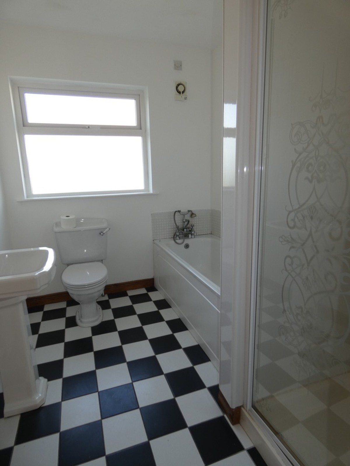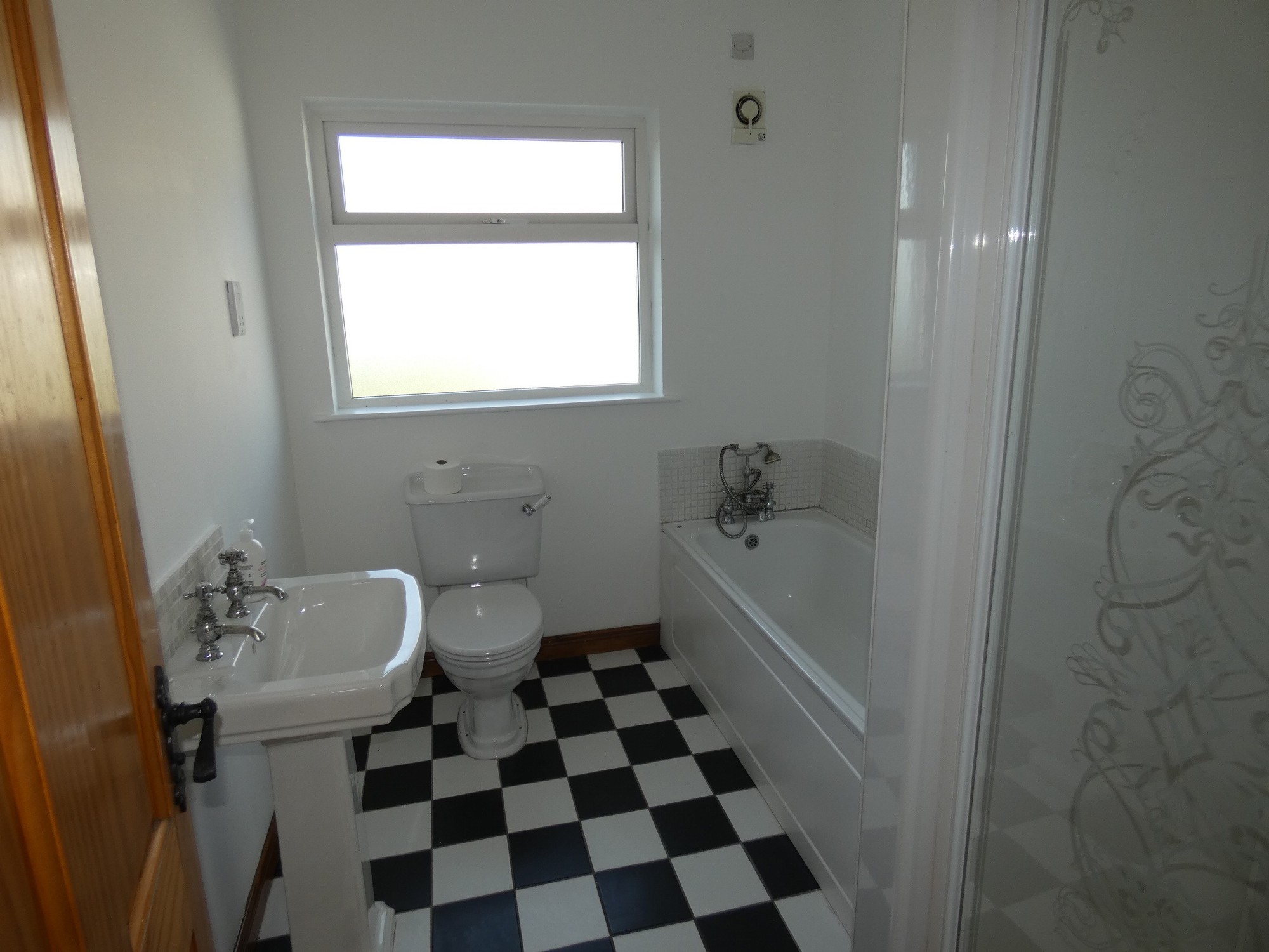 Comprising a fitted suite including a wc, a large pedestal wash hand basin with a tiled splashback, panel bath with a tiled splashback and a telephone hand shower attachment, tiled floor, extractor fan, and a panelled shower cubicle with a Mira shower.