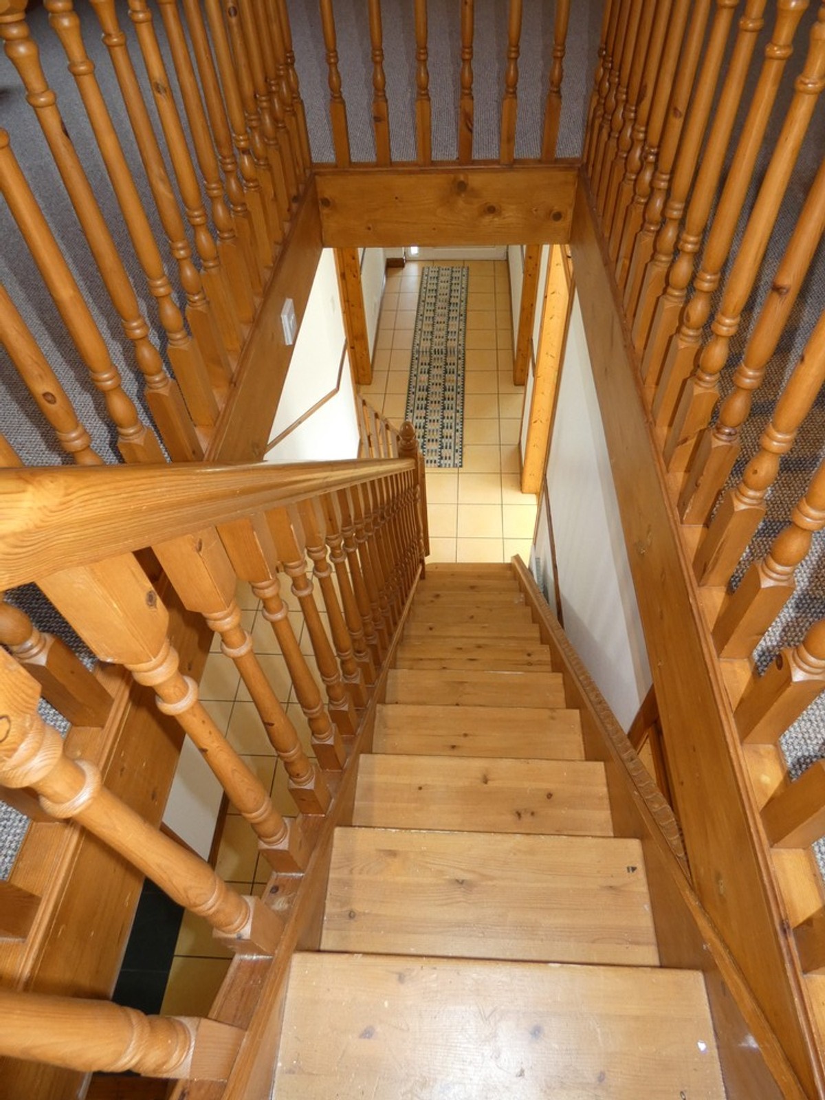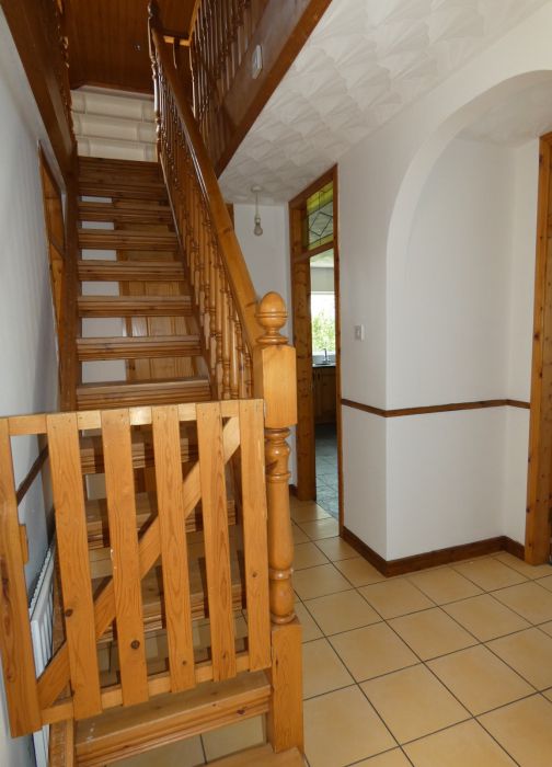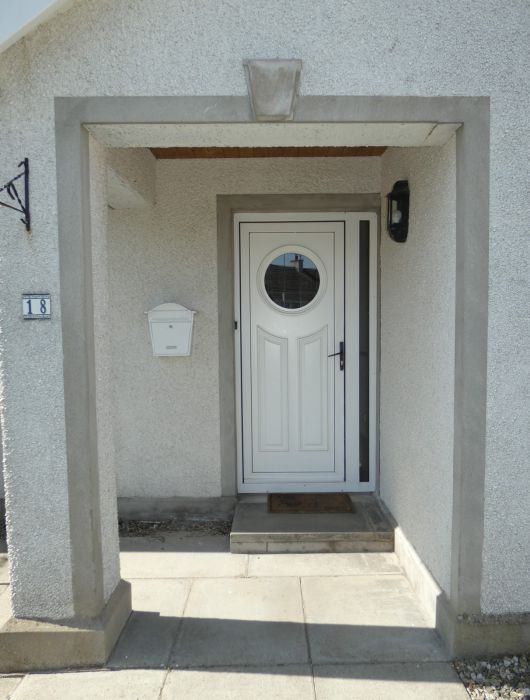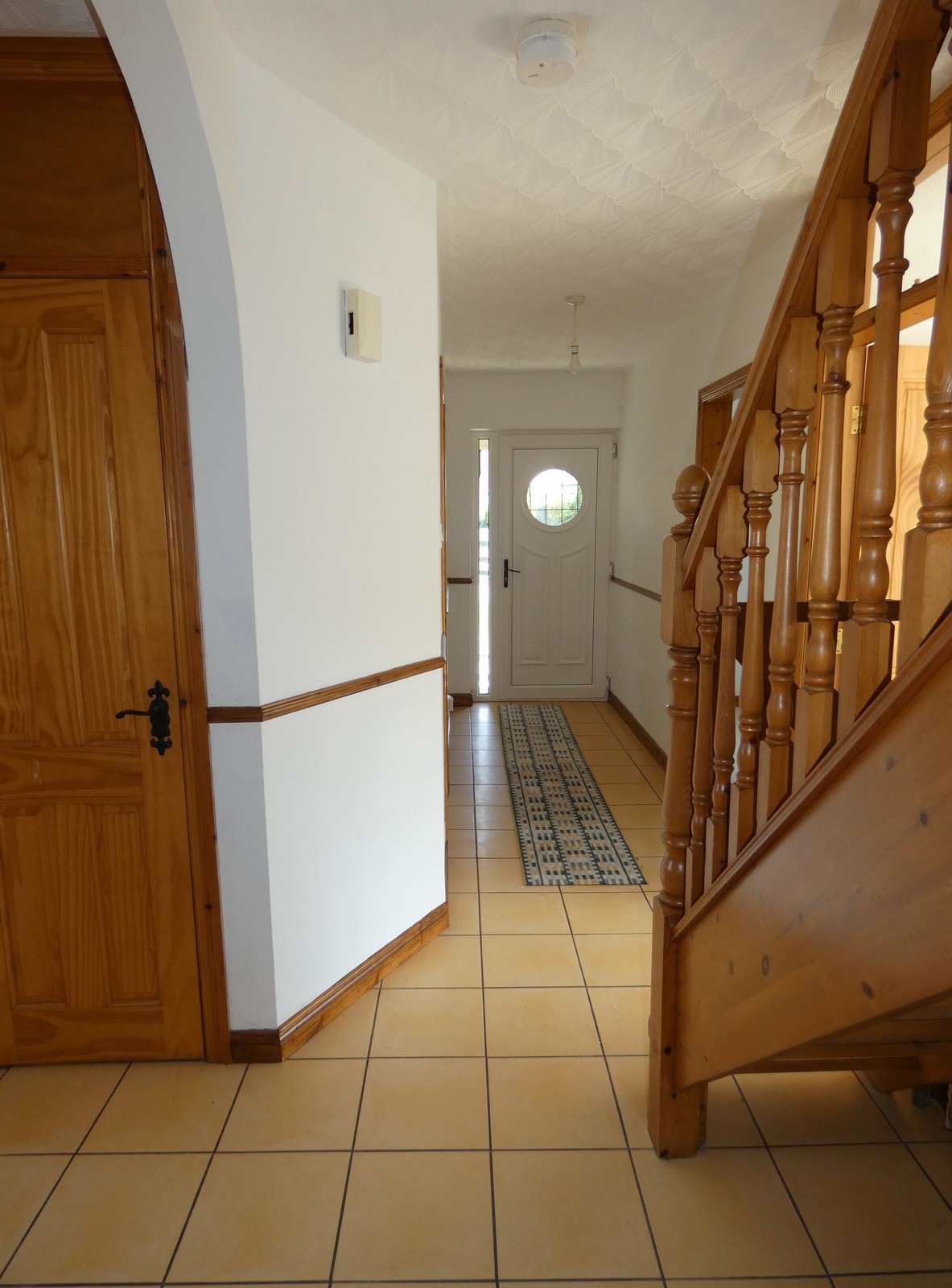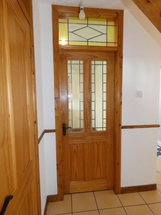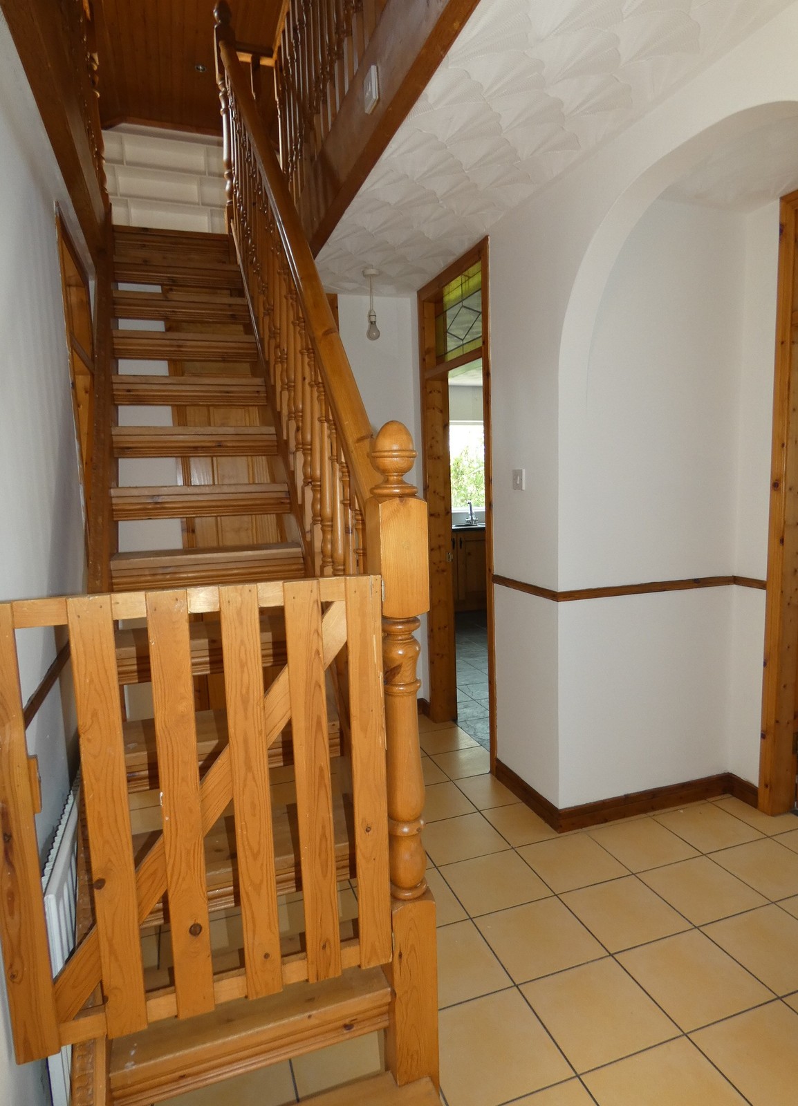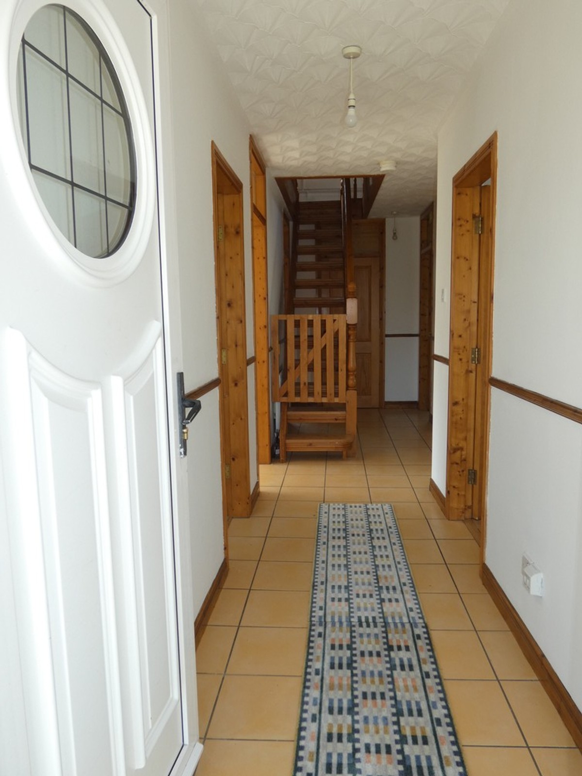 Partly glazed Upvc front door with a glazed side panel, tiled floor, shelved cloaks cupboard, shelved airing cupboard and stairs to the upper floor accommodation.