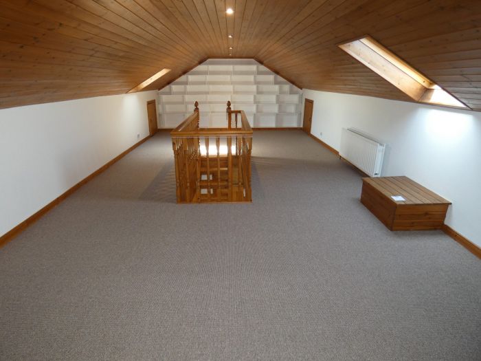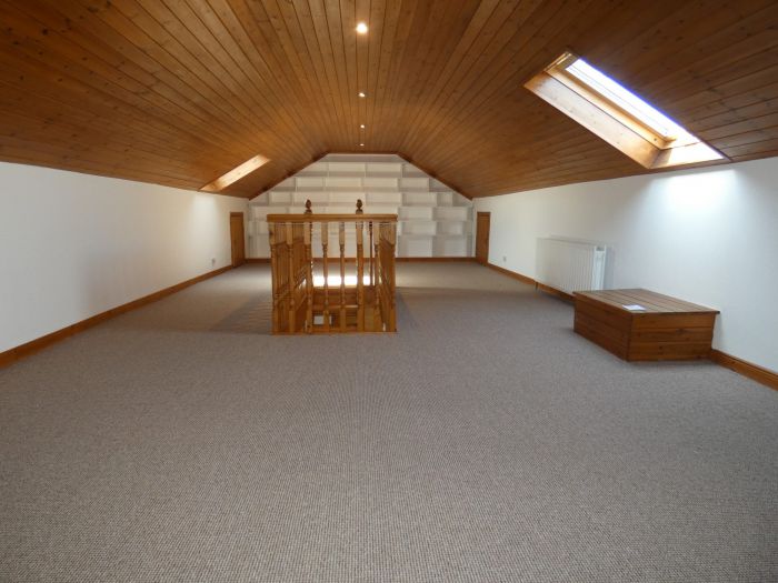 A super first floor bedroom or games room with velux windows, a feature wood sheeted ceiling, fitted shelving and access points to eaves attic storage areas.