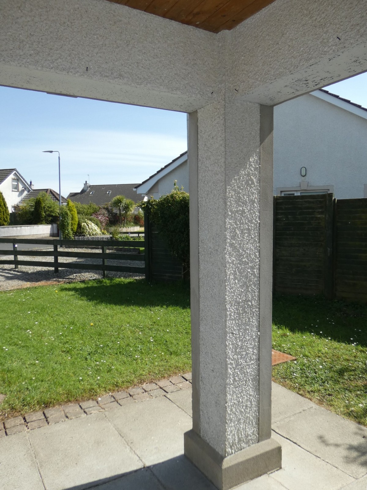 Garden in lawn to the front with various shrubs and a pavia patio area.
