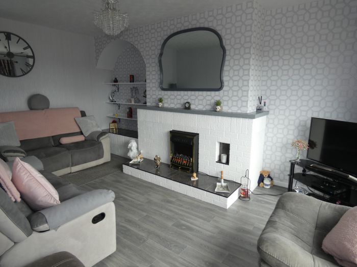 Feature painted brick fireplace with a tiled hearth, back boiler (heats the radiators), tiled mantle and a raised T.V. shelf/display area, attractive wood flooring and a feature low level window providing a super outlook to the front.
