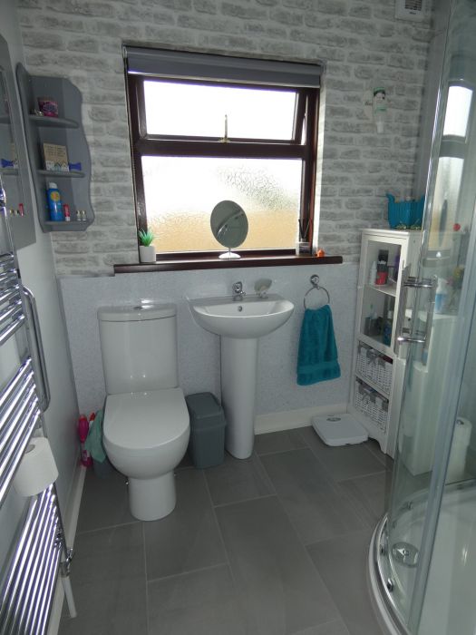 Recently fitted contemporary shower room including a wc, a pedestal wash hand basin, heated chrome towel rail, extractor fan, tiled floor and a panelled corner shower cubicle in a glazed enclosure with a Creda electric shower.