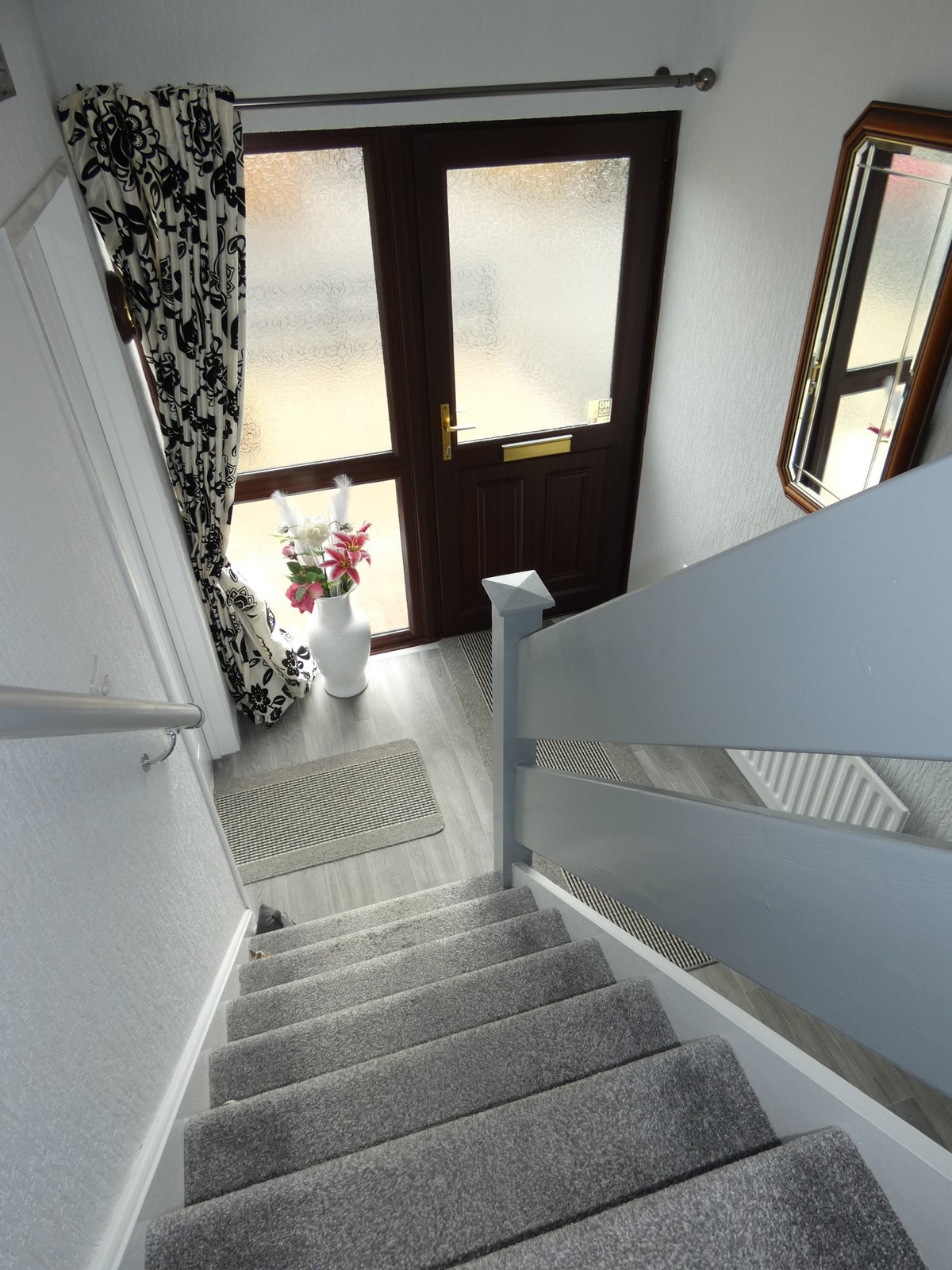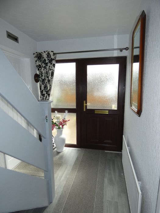 Partly glazed front door with a matching glazed side panel, wooden flooring and a shelved airing cupboard.