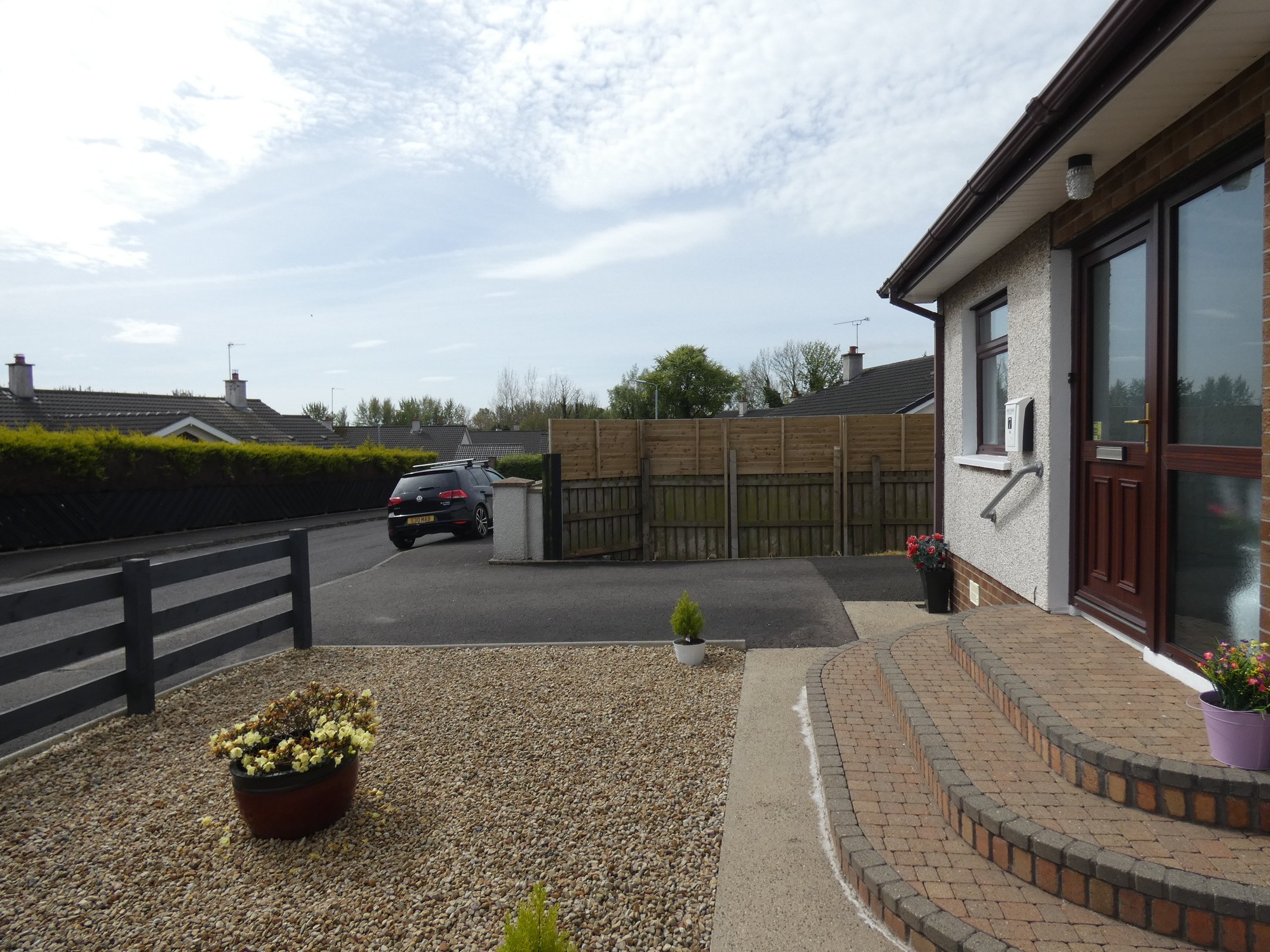 Landscaped garden area to the front laid in colour stones and with attractive brick pavia steps to the front door.
