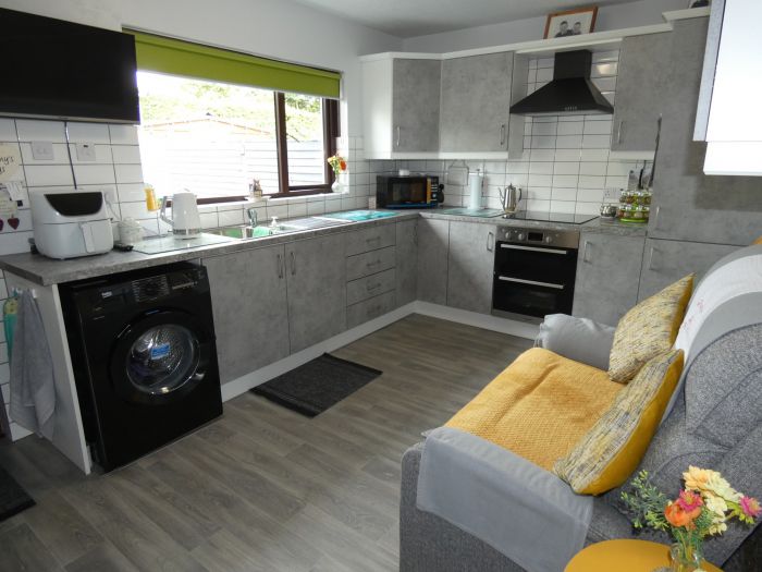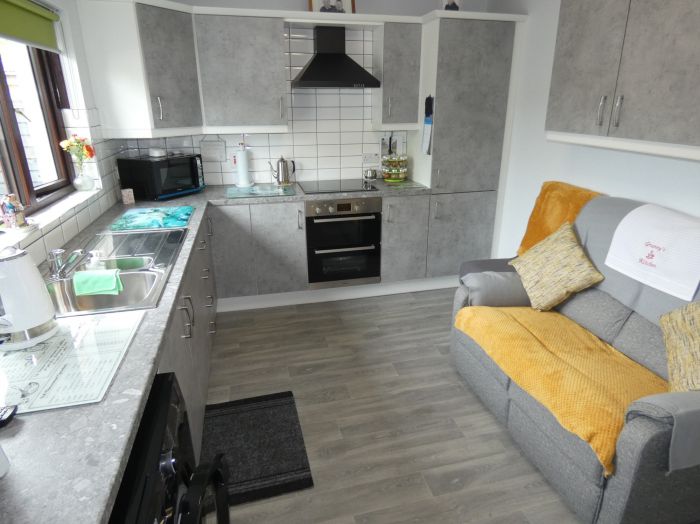 Recently fitted new kitchen with a range of eye and low level units, bowl and a half stainless steel sink unit, low level double oven, ceramic hob with an extractor fan over, integrated fridge/freezer, tiled between the worktop and the eye level units, plumbed for an automatic washing machine, attractive wood flooring and a door to the private rear garden area.