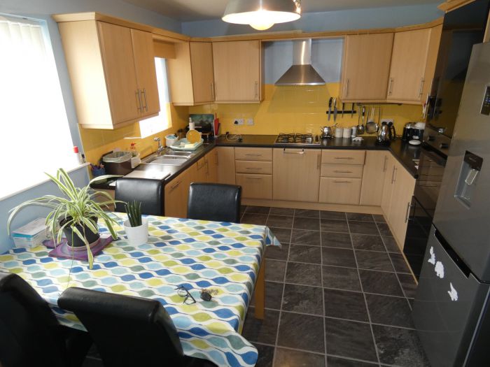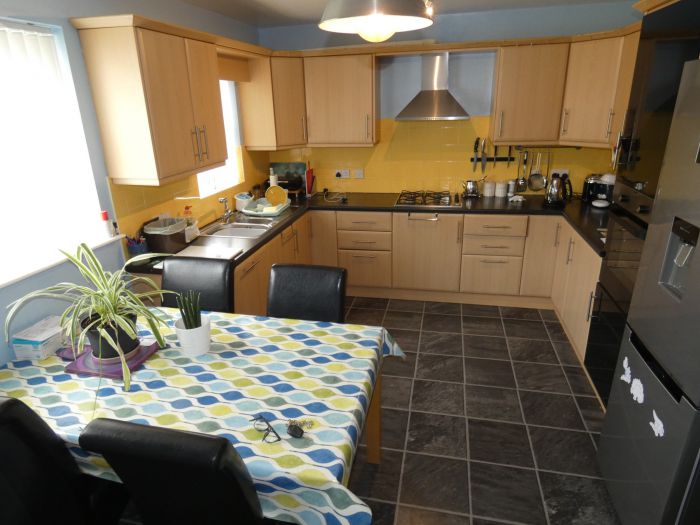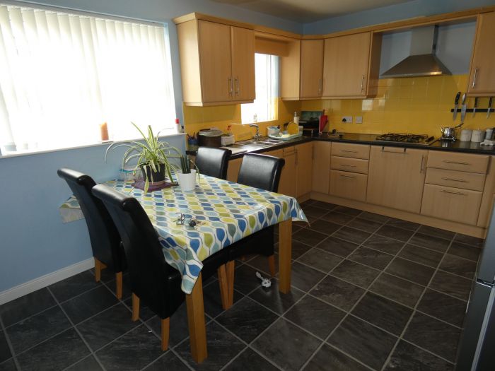 With a range of fitted eye and low level units, bowl and a half stainless steel sink, tiled between the worktop and the eye level units, eye level oven, gas hob with a stainless steel extractor fan over, integrated dishwasher, space for an upright fridge/freezer, pan drawers, tiled effect flooring, dining area overlooking the rear garden and a door to the utility room.