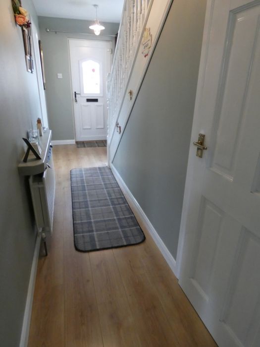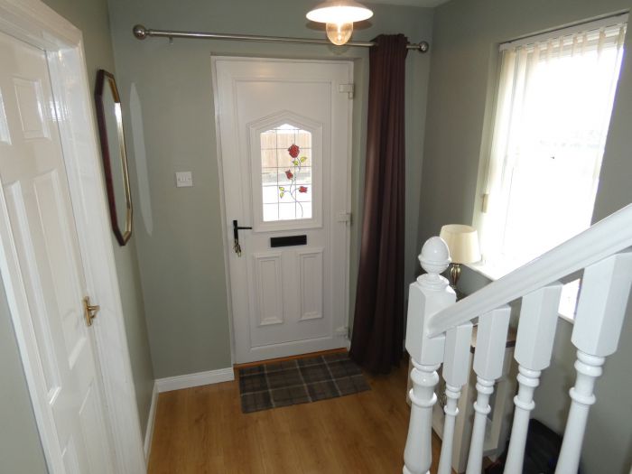 Partly glazed Upvc front door, wooden flooring, telephone point and a cloakroom under the stairs with a light.