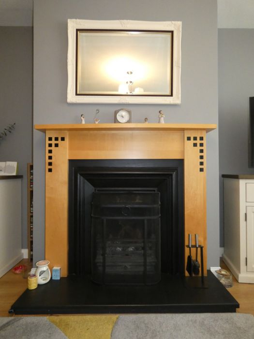 Spacious living room with an open fire.