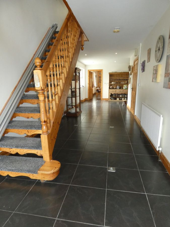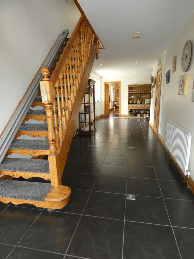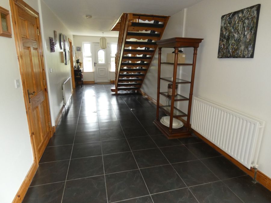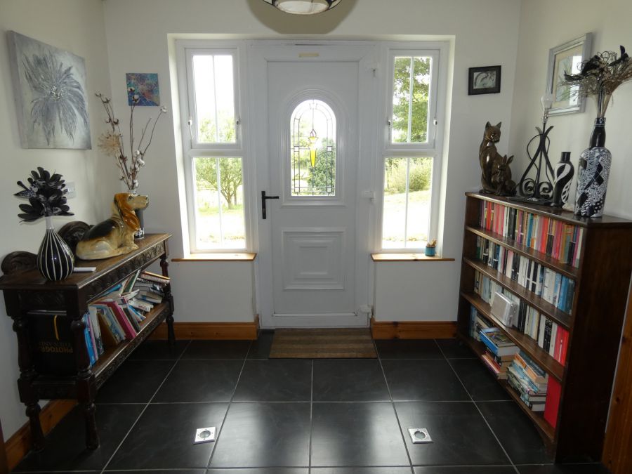 Partly glazed upvc front door, with glazed side panels, contemporary tiled flooring with recessed floor spotlights, recessed ceiling spotlights, telephone point and a separate cloakroom.