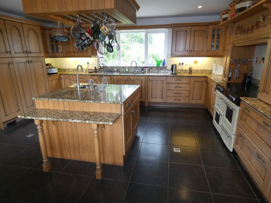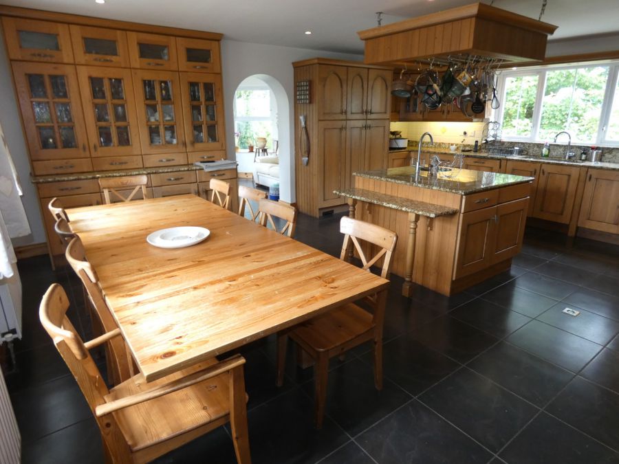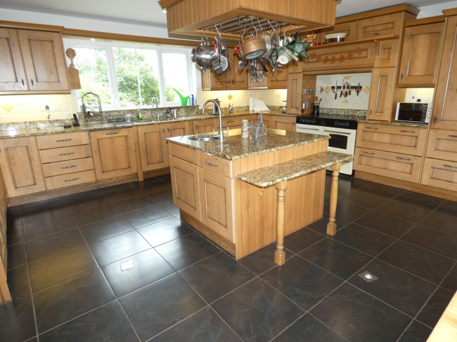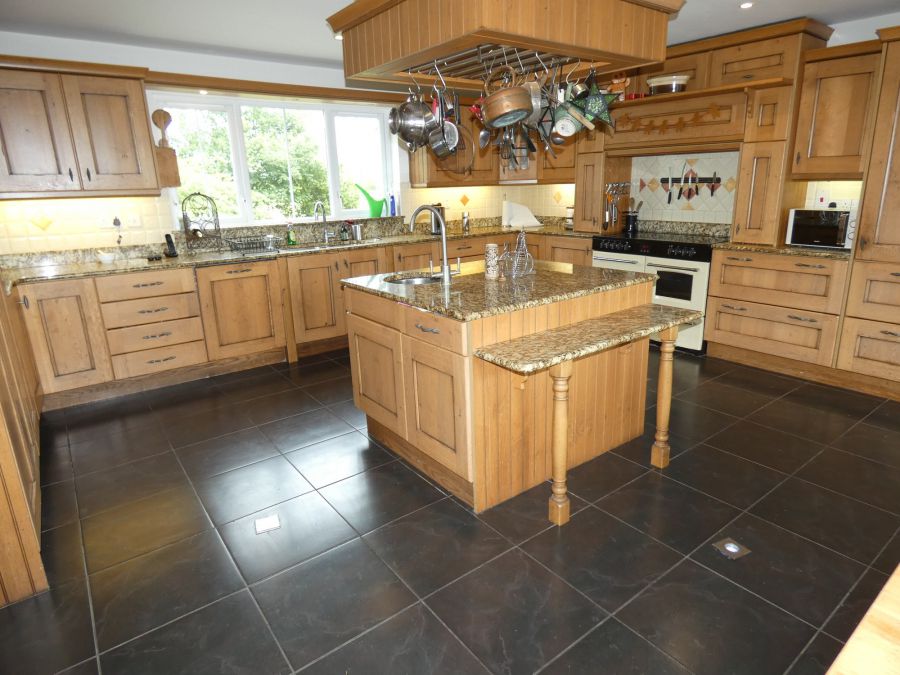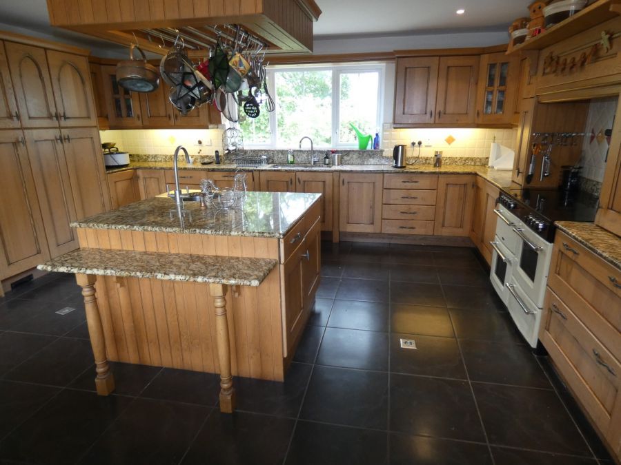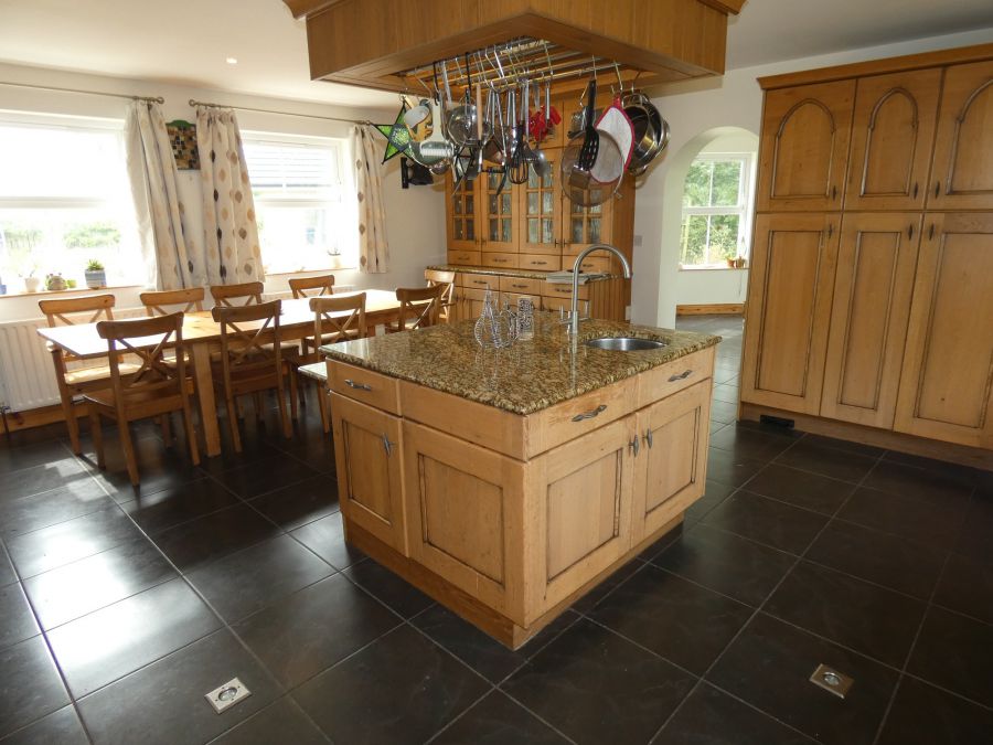 With an extensive range of fitted eye and low level units, inset double bowl stainless steel sink, granite worktops, integrated dishwasher, integrated fridge, "Belling" range type cooker with two ovens and a grill plus a ceramic top providing 5 rings and a hot plate, overmantle style surround with an integrated extractor fan, pan drawers, glass display units, larder units, a large dresser unit, island unit / breakfast bar with a granite worktop and an inset stainless steel sink unit; attractive tiled flooring with recessed floor spotlights, recessed ceiling spotlights and an arch to the Sun Room.