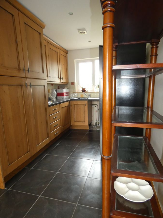 With a range of fitted eye and low level units, stainless steel sink unit, larder cupboard, plumbed for automatic washing machine, space for a tumble dryer, tiled floor and recessed ceiling spotlights.