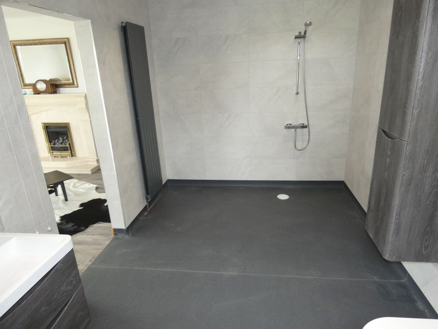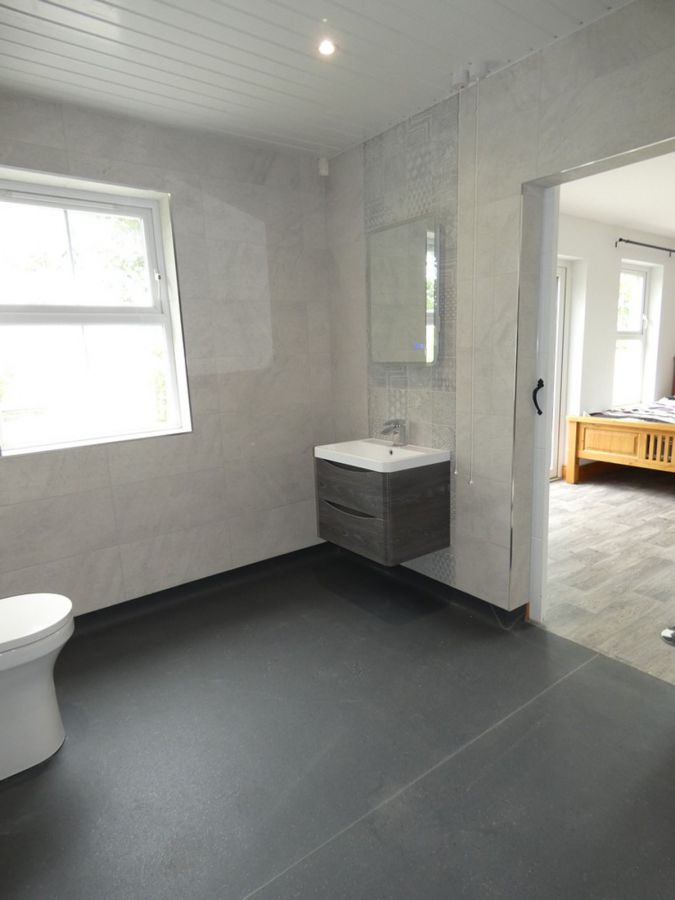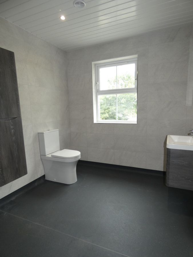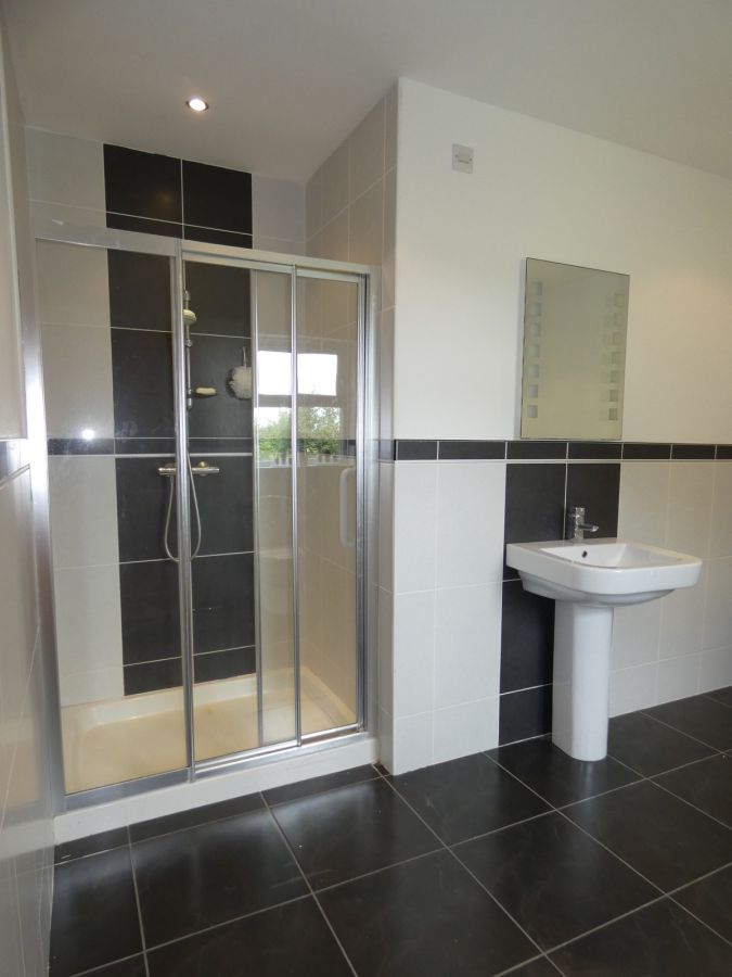 Comprising of a panel bath with a tiled splash back, a wall mounted wash hand basin with a tiled splash back, heated towel rail, shaver point, tiled floor with inset floor spotlights, extractor fan and a tiled shower cubicle with a mains mixer shower and a glass enclosure.