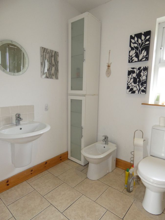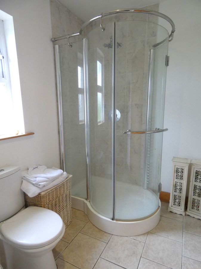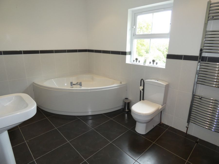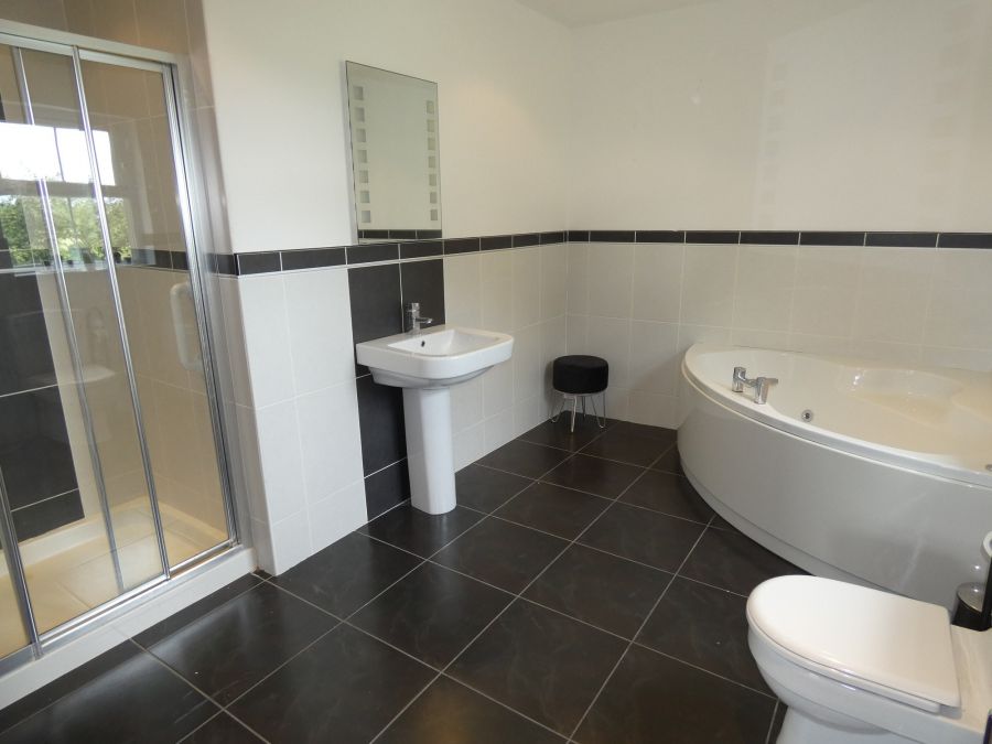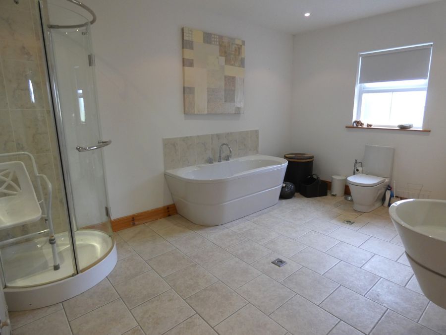 With a corner panel jacuzzi bath, w.c, heated chrome towel rail, pedestal wash hand basin, part tiled walls, tiled floor, superb views to the side, recessed spotlights, extractor fan and a tiled shower cubicle with a mixer shower.