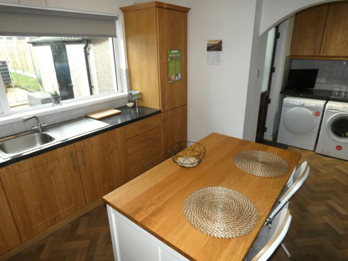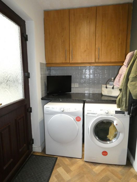 With a fitted worktop and eye level units, tiled between the worktop and the eye level units, plumbed for an automatic washing machine, vented and space for a tumble dryer; and a partly glazed upvc door to the rear.
