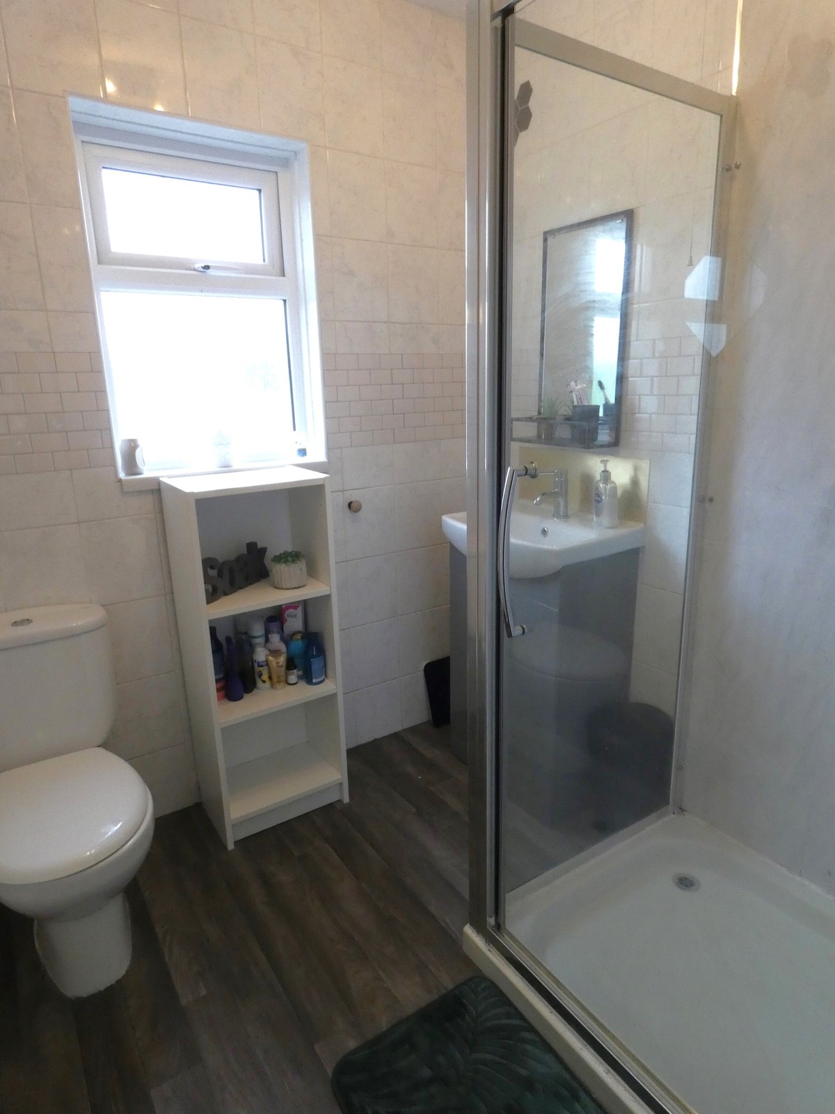 A bright family shower room with a wc, a contemporary vanity unit with storage below, tiled walls and a spacious panelled shower cubicle with a Triton electric shower.
