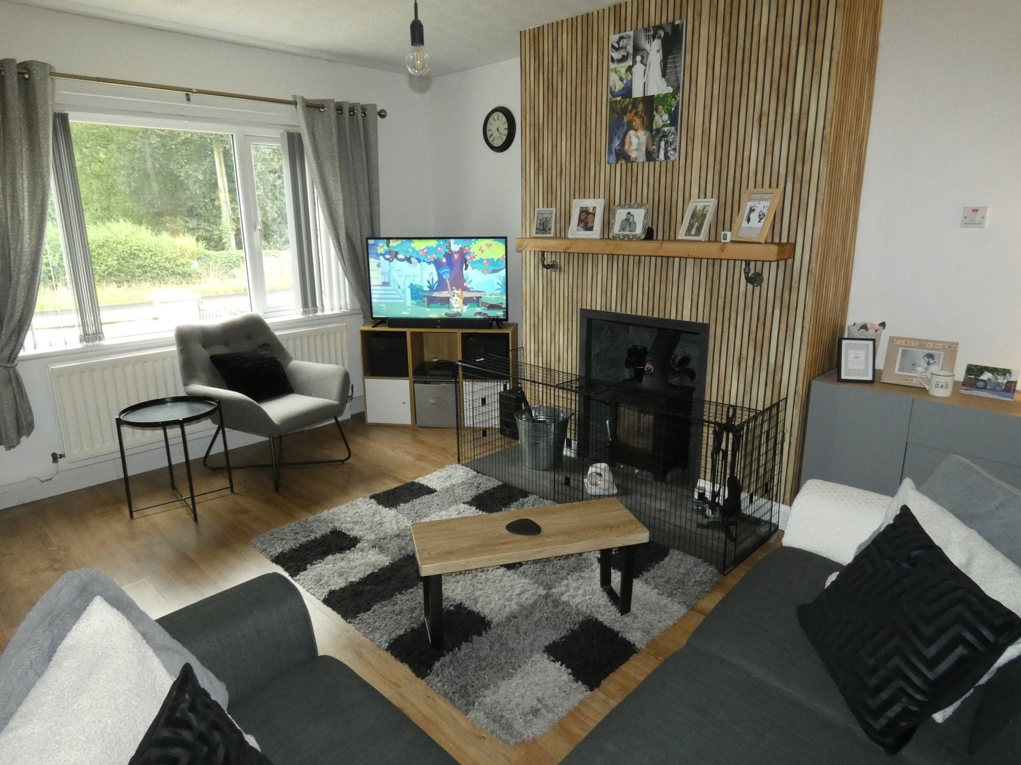 Living room with an inset multi fuel stove and a pleasant outlook to the front.