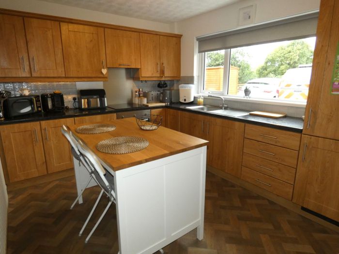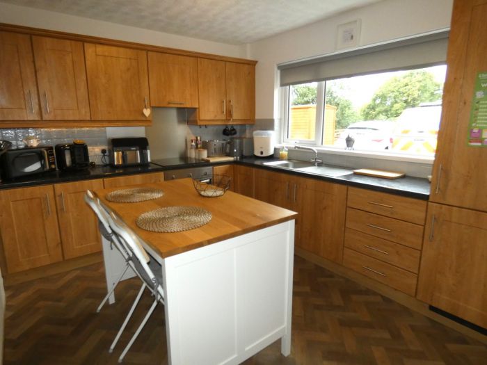 With a range of fitted eye and low level units, single bowl and drainer stainless steel sink, tiled splashback around the worktop, electric oven, ceramic hob with an extractor fan over, integrated fridge freezer, views over the garden and patio area to the rear, a central island/breakfast bar seating area and open plan to the utility area.