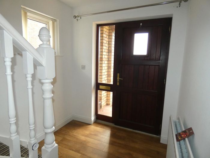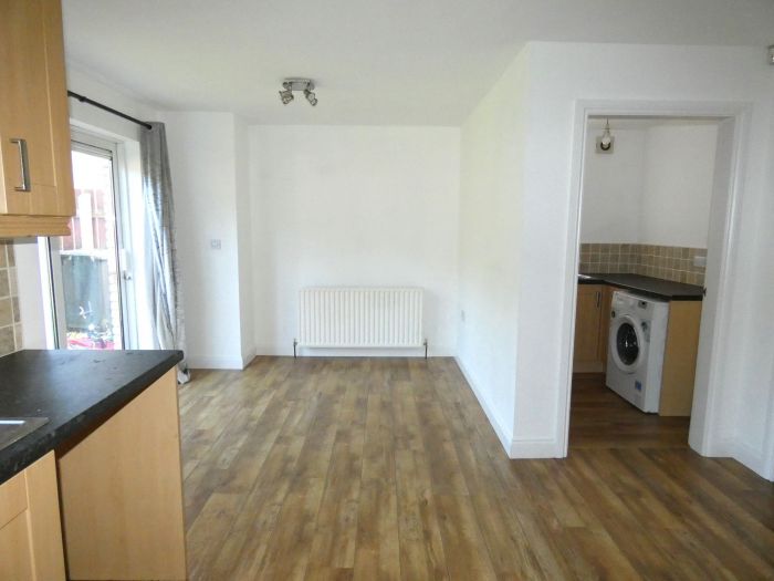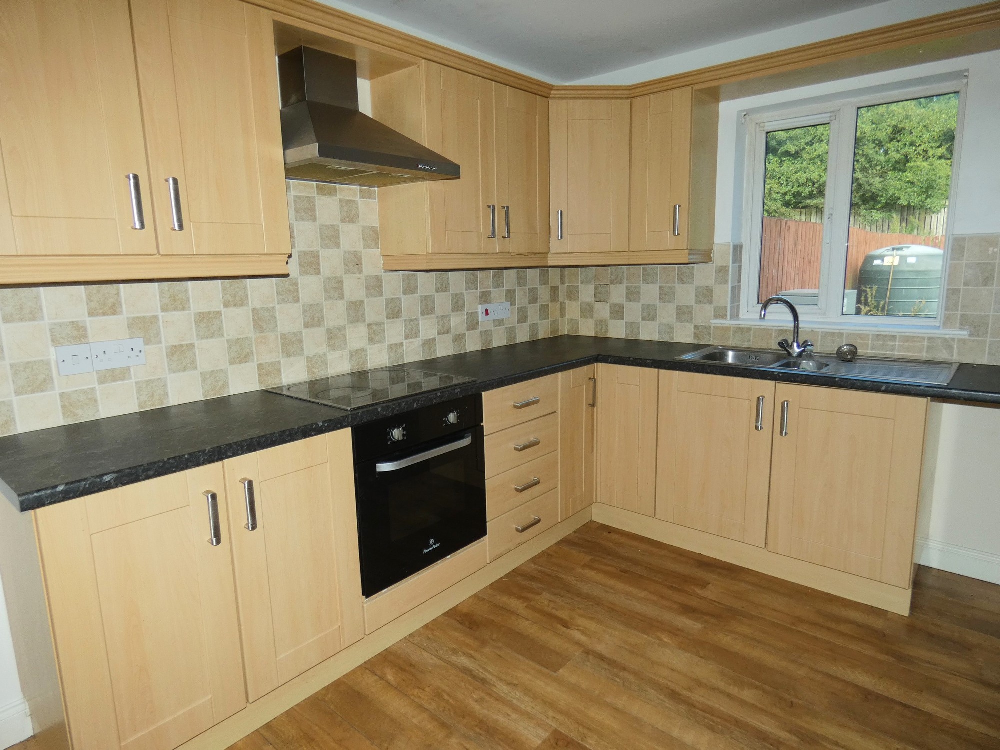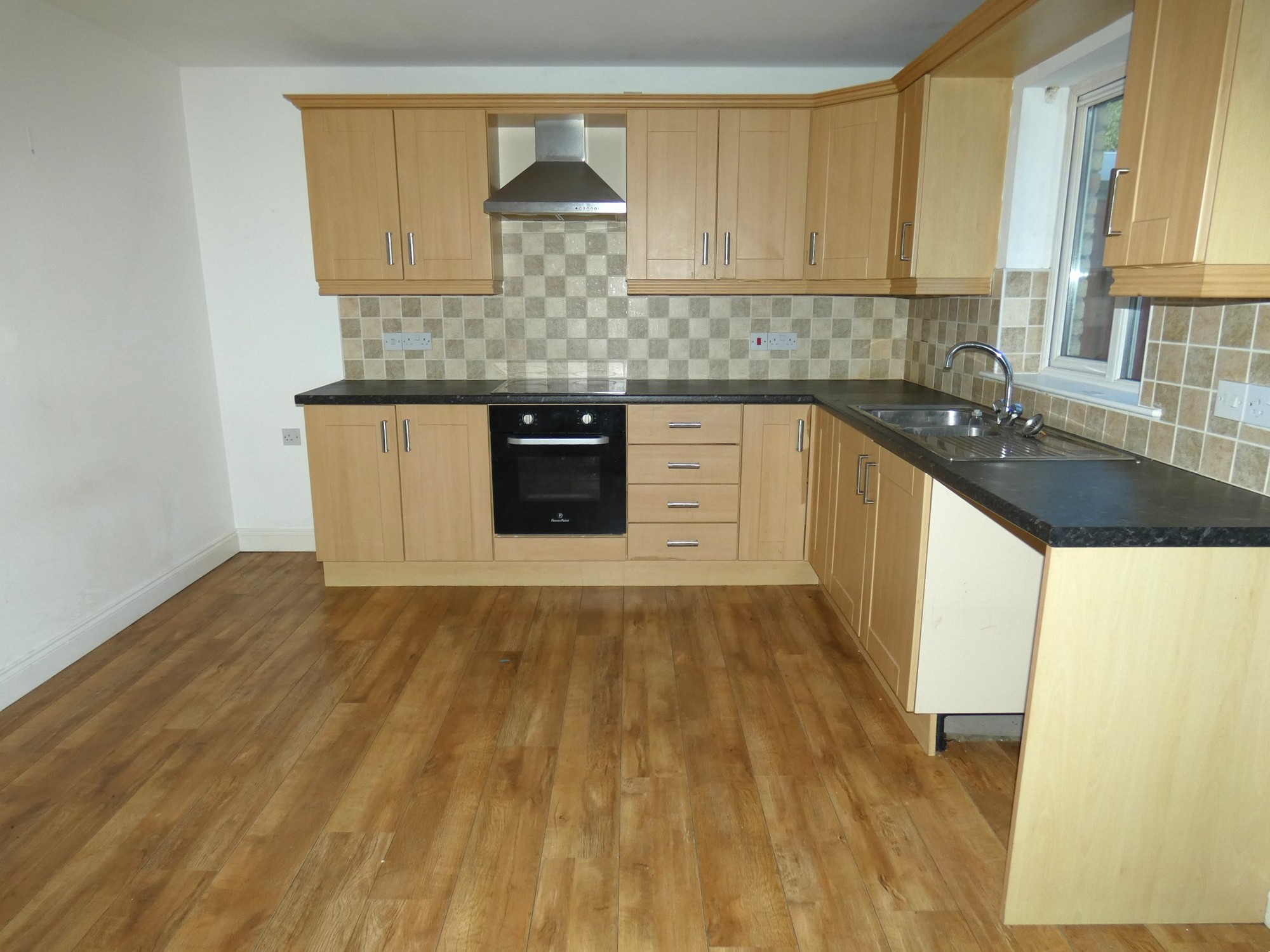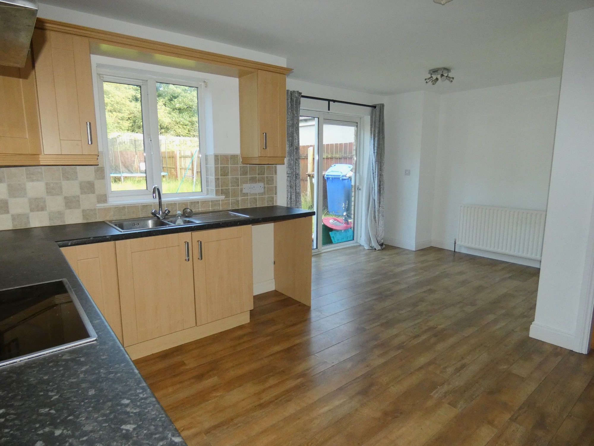 With a range of eye and low level units including electric hob, electric oven, stainless steel extractor fan, 1 ½ bowl stainless steel sink unit, window pelmet, part tiled walls, wood laminate flooring, patio doors to rear garden area.