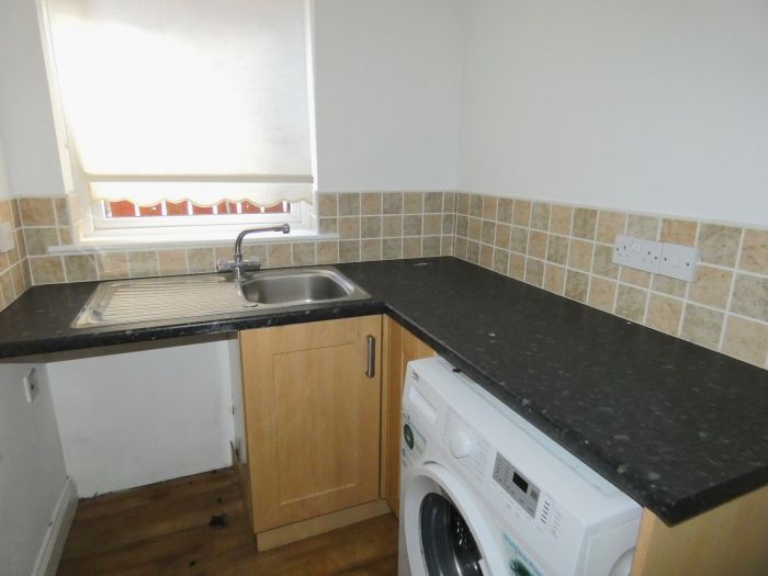 With low level units, stainless steel sink unit, plumbed for an automatic washing machine, space for a tumble dryer, tiled above worktop, extractor fan.