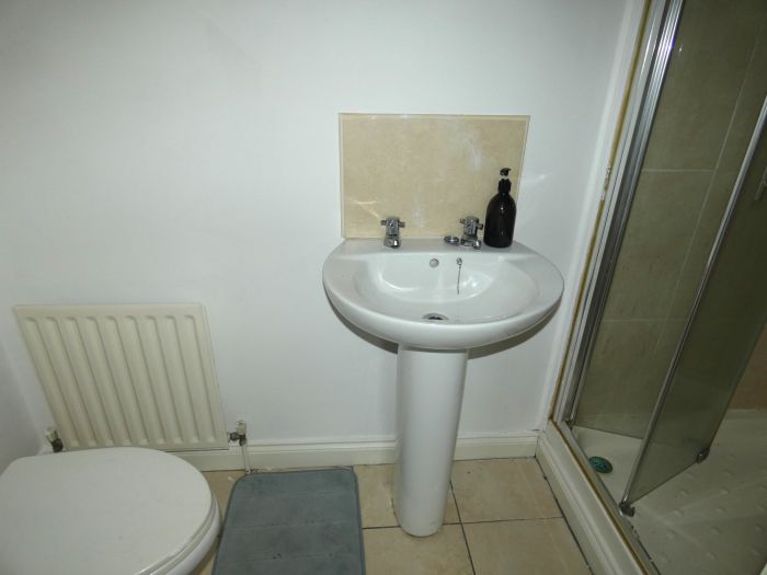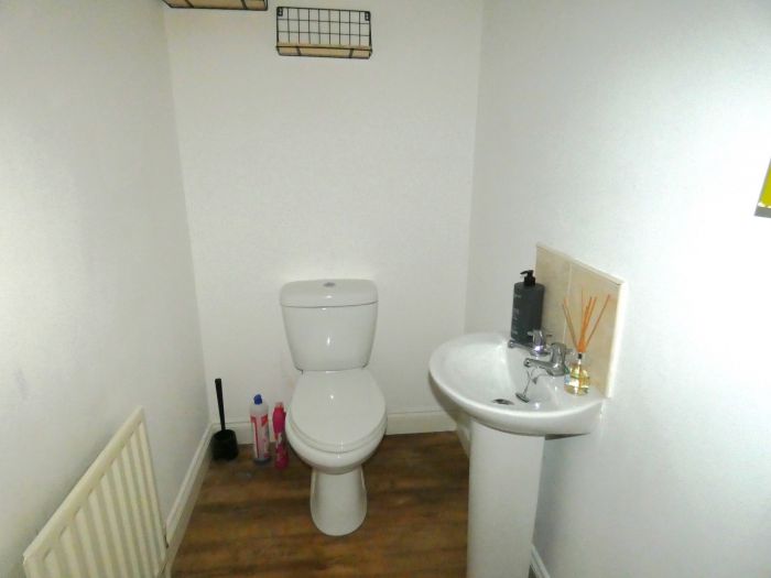 With w.c, wash hand basin, tiled splashback, wood laminate flooring, extractor fan.