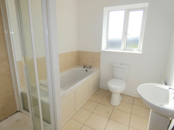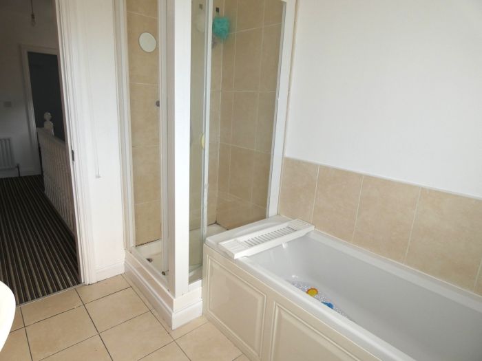 With fitted suite including bath, w.c, wash hand basin, tiled splashback, tiled around bath, thermostatic shower, tiled cubicle, extractor fan, tiled floor.