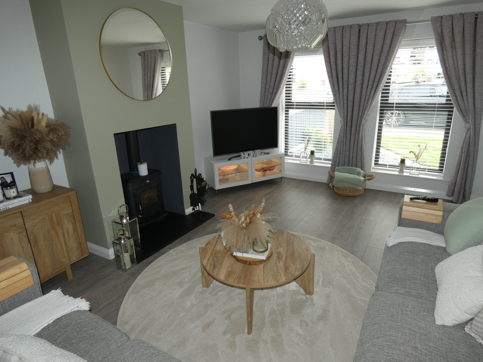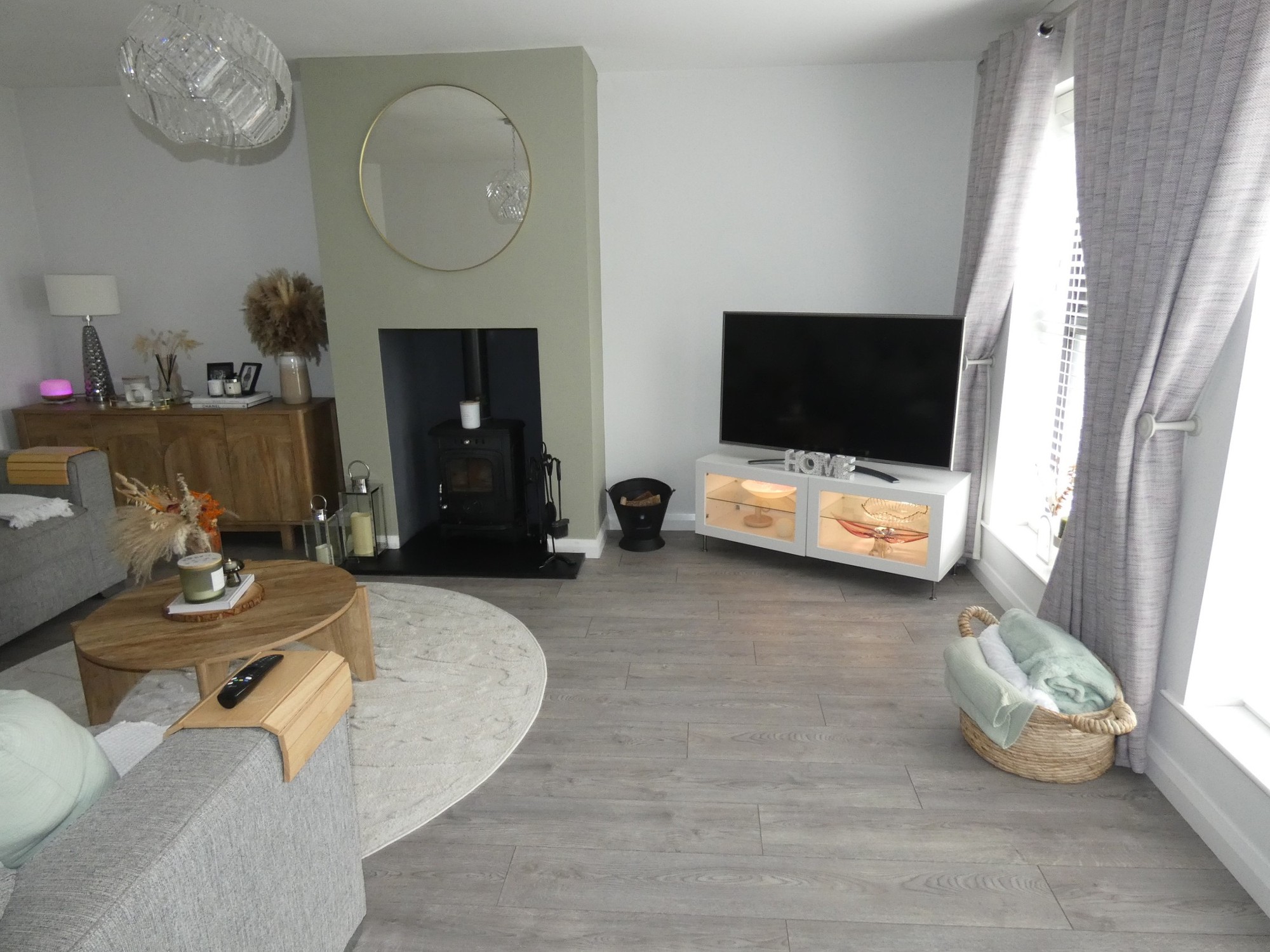 Inset multi fuel stove on a granite hearth, wired for a T.V., contemporary wooden flooring and an open view over the avenue to the front.