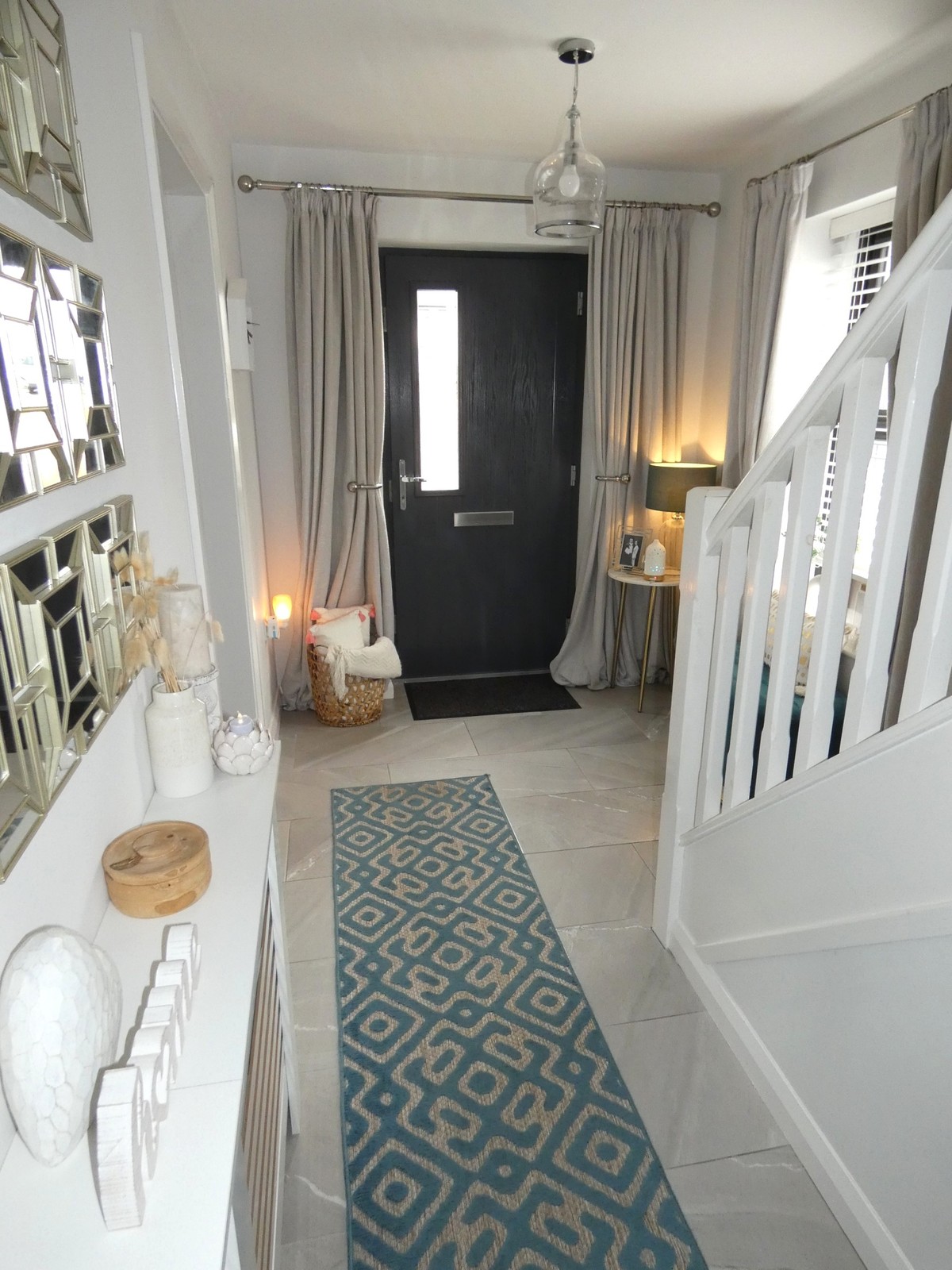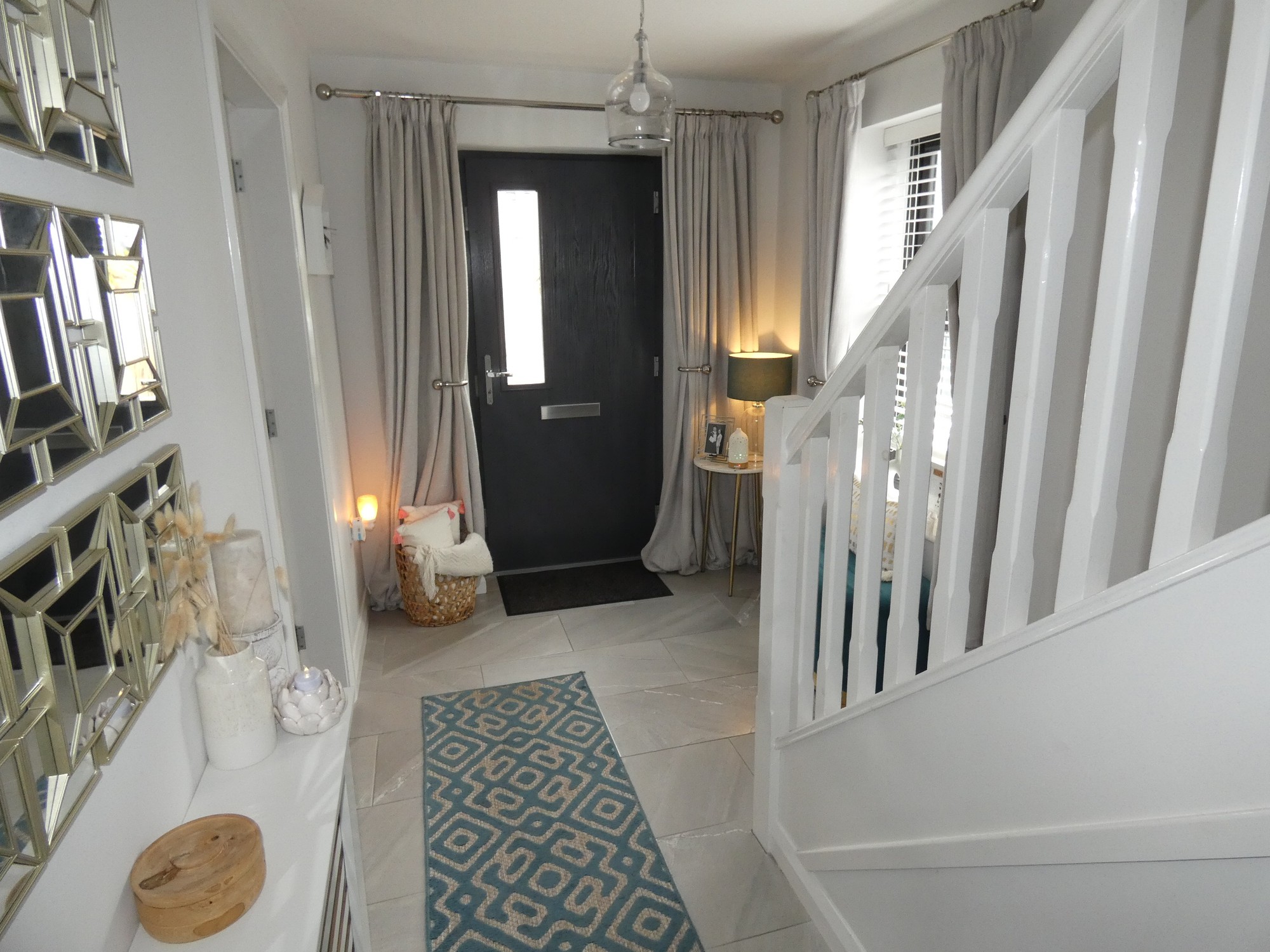 Partly glazed composite front door, contemporary tiled flooring, storage under the stairs, telephone point and a separate cloakroom.