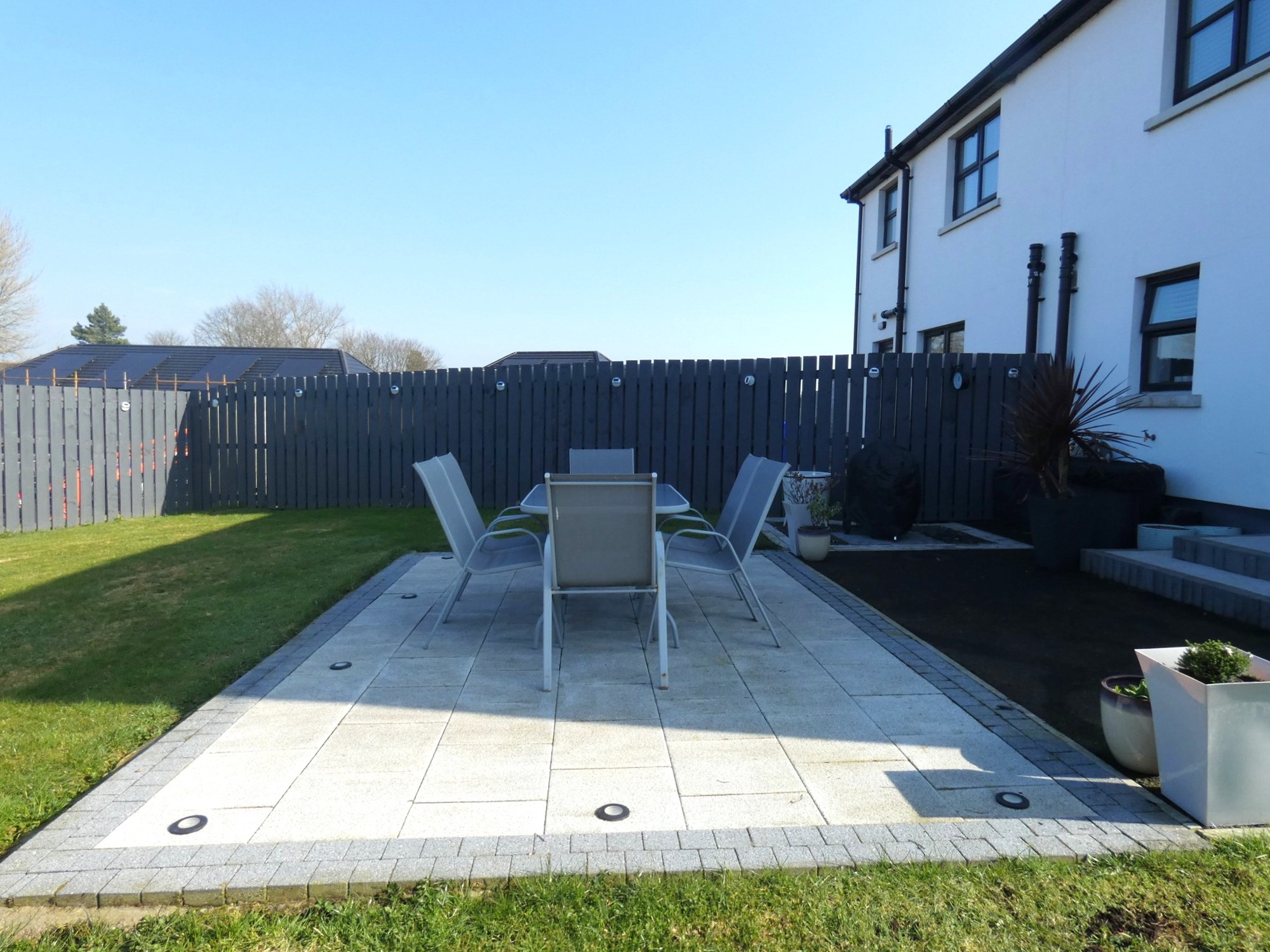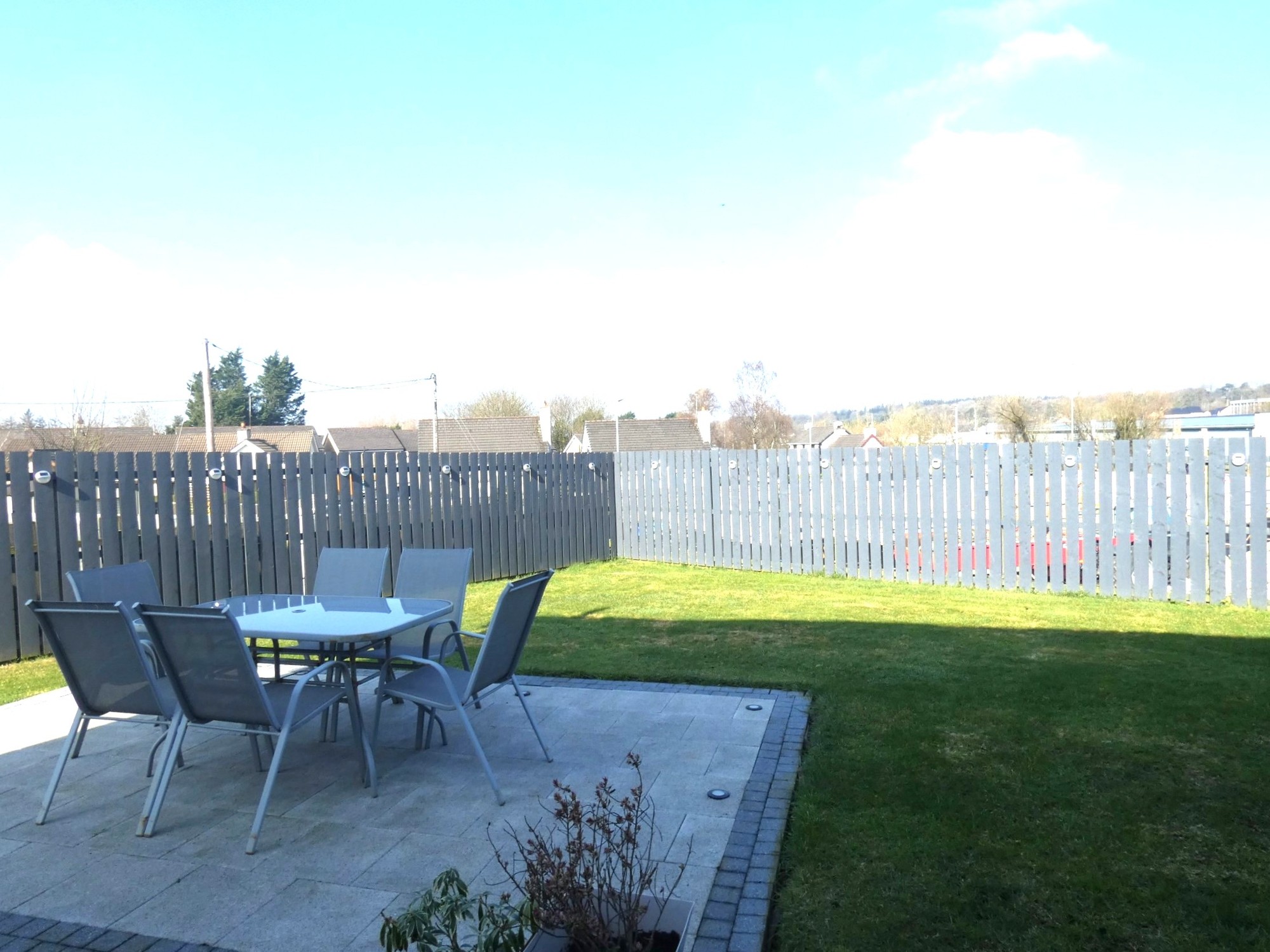The spacious rear garden includes an area laid in lawn and a spacious patio area with recessed display lighting.