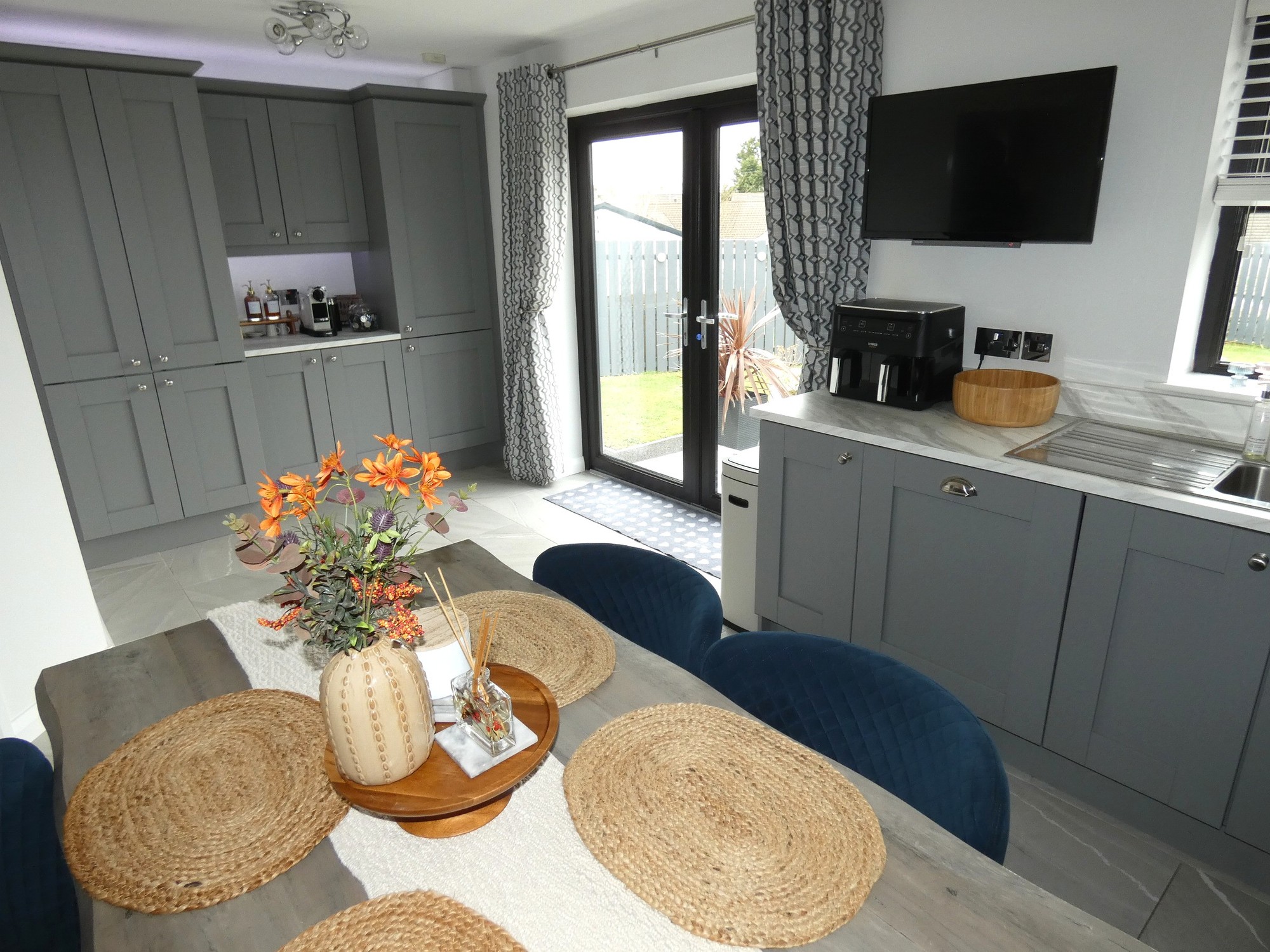 A contemporary kitchen with a generous range of painted finish eye and low level units, worktop with a matching upstand splashback, bowl and a half stainless steel sink, integrated fan oven, touch control induction hob with a stainless steel extractor canopy over, integrated fridge/freezer, larder unit, integrated dishwasher, contemporary flooring; and a utility/dresser area with a cupboard to house a washing machine and a tumble dryer; then french doors to the landscaped rear garden.