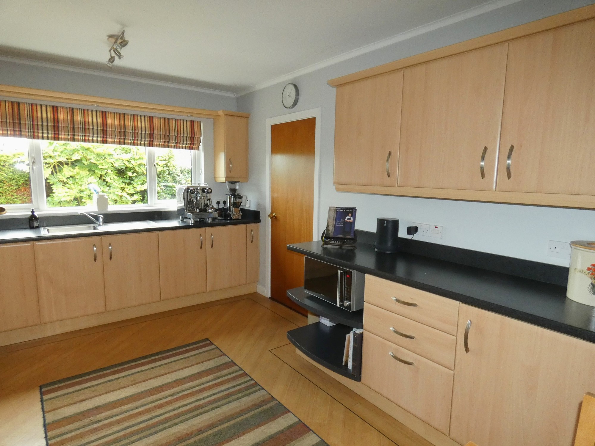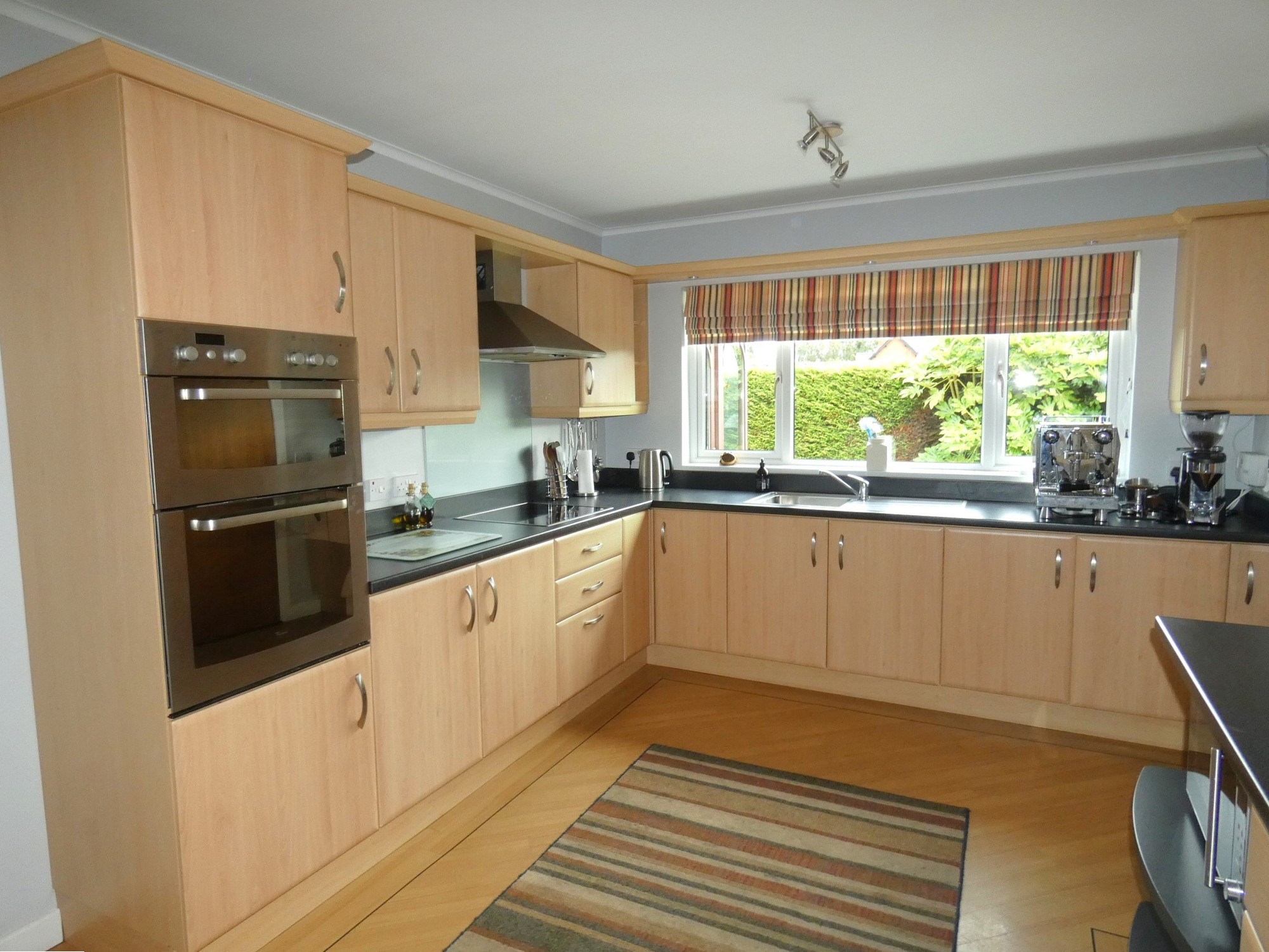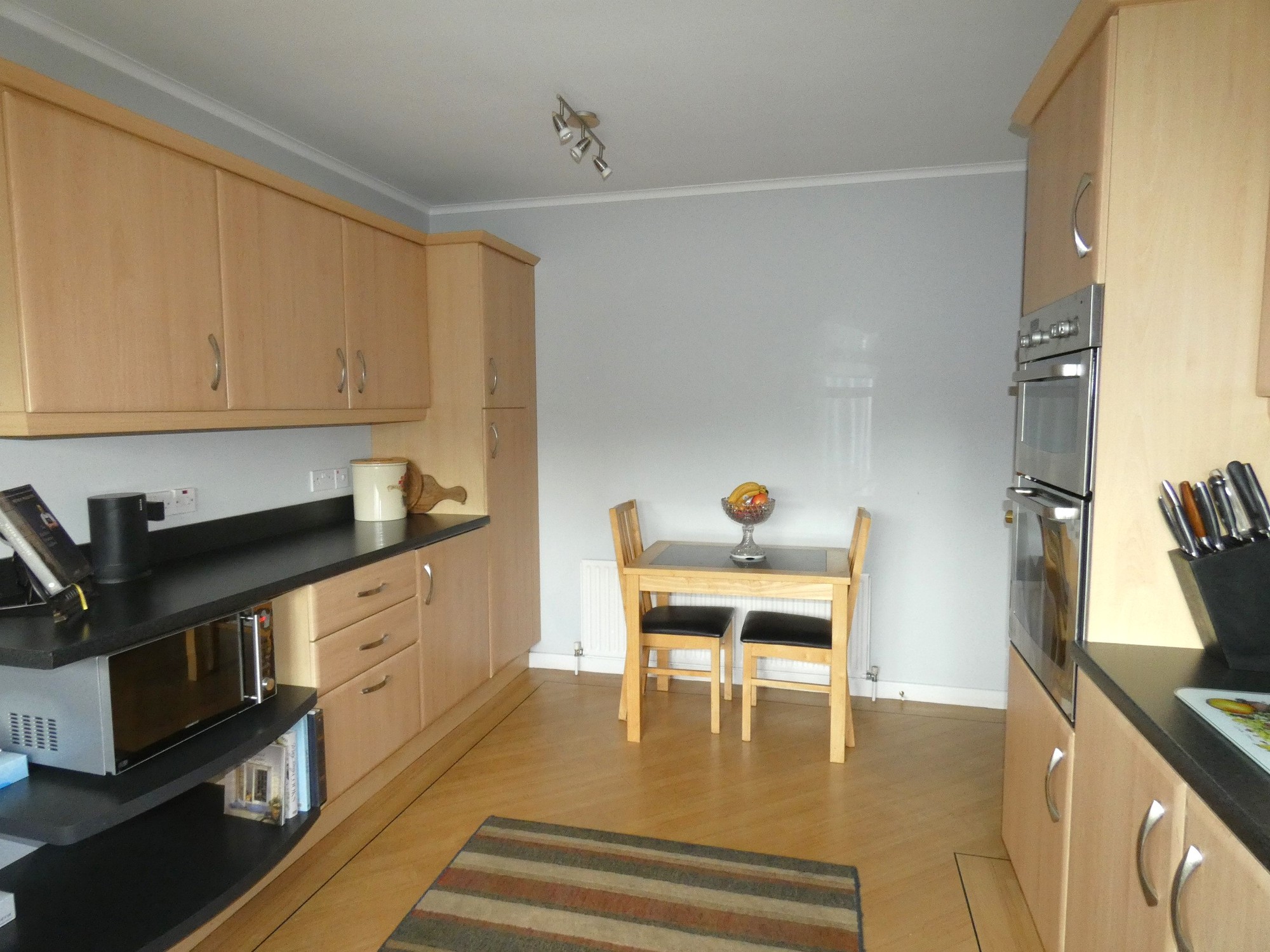 With a range of eye and low level units including Fagor electric ceramic hob, stainless steel extractor fan, Whirlpool electric double oven including grill, integrated fridge, stainless steel sink unit, window pelmet with downlights, Carndean flooring.