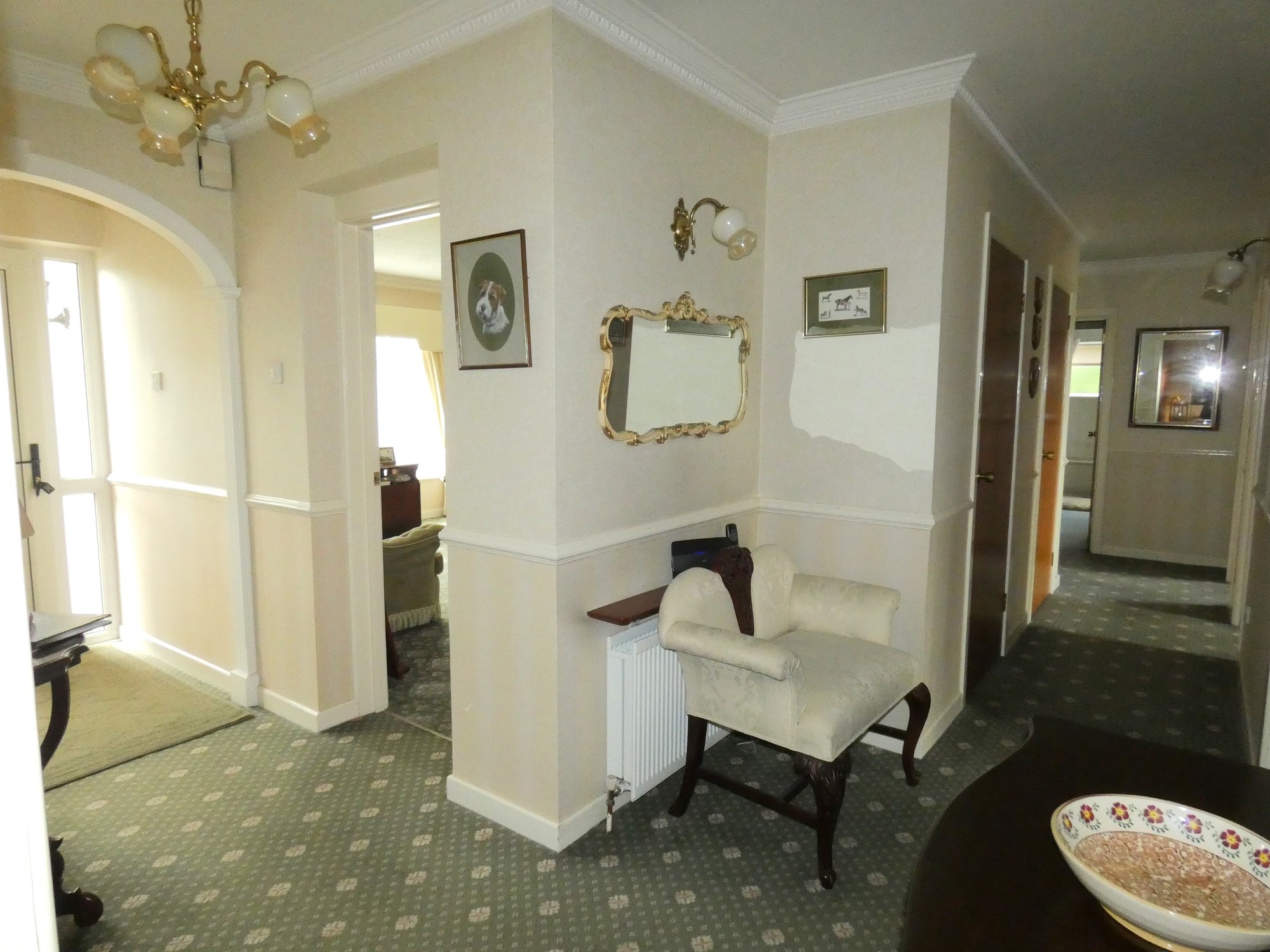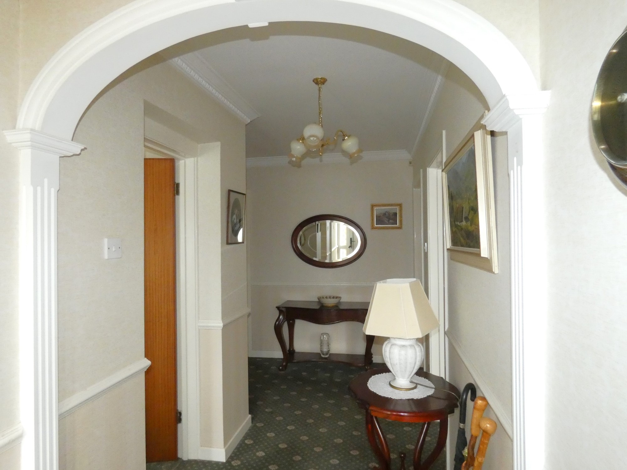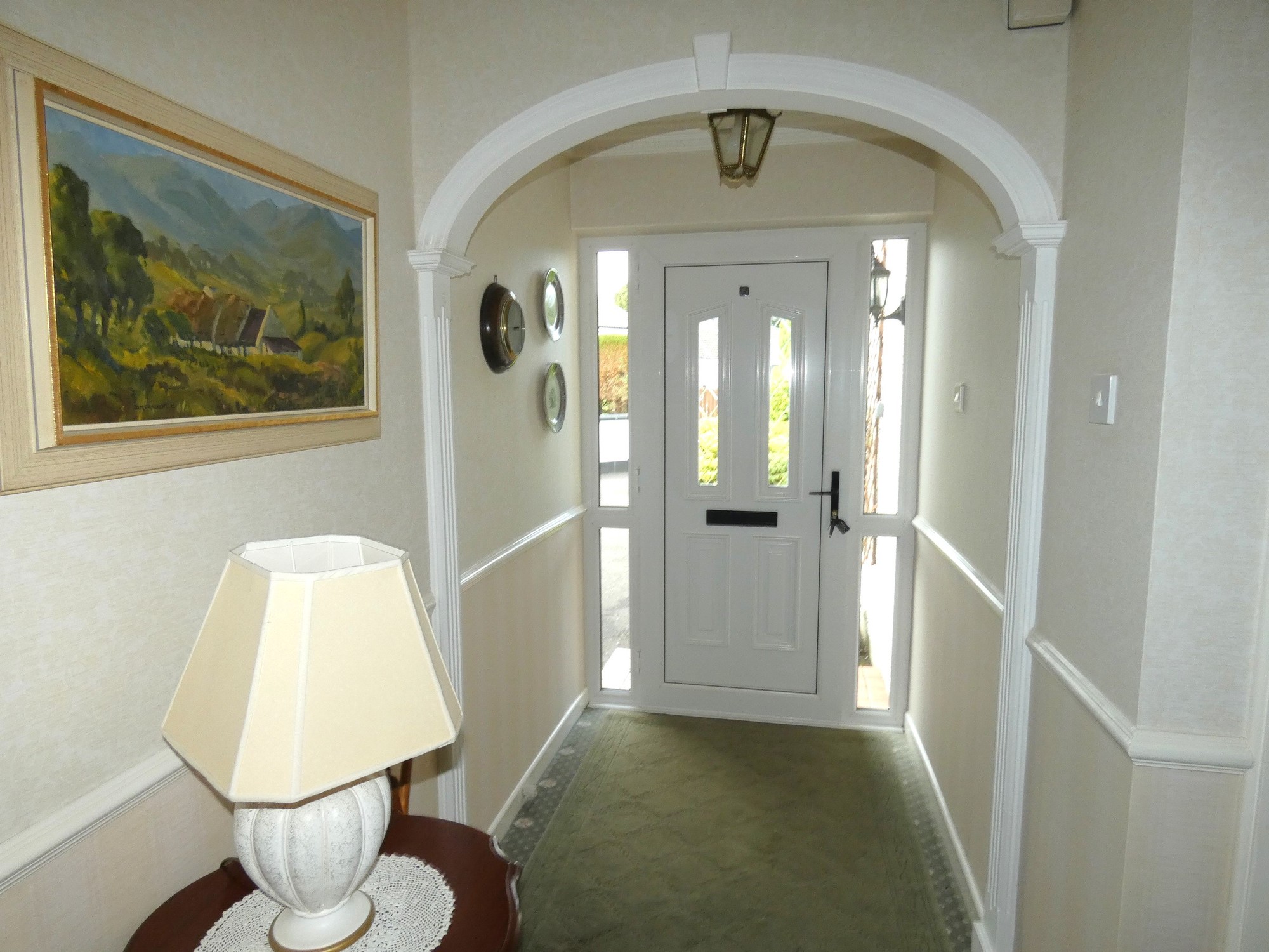 Coved ceiling, dado rail, decorative archway, upvc entrance door and side panels.