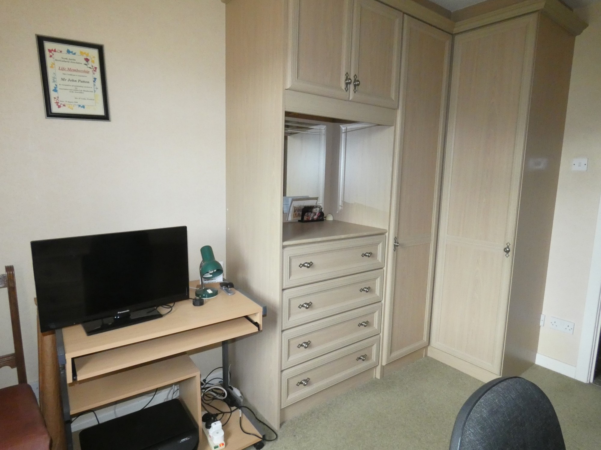 With fitted bedroom units including wardrobes, drawers, storage cupboards, mirror.