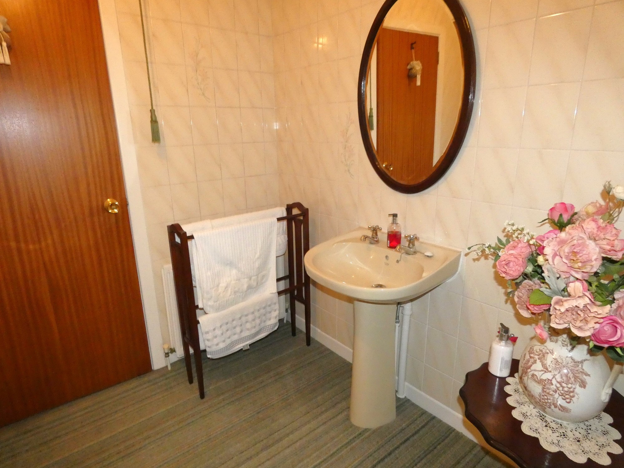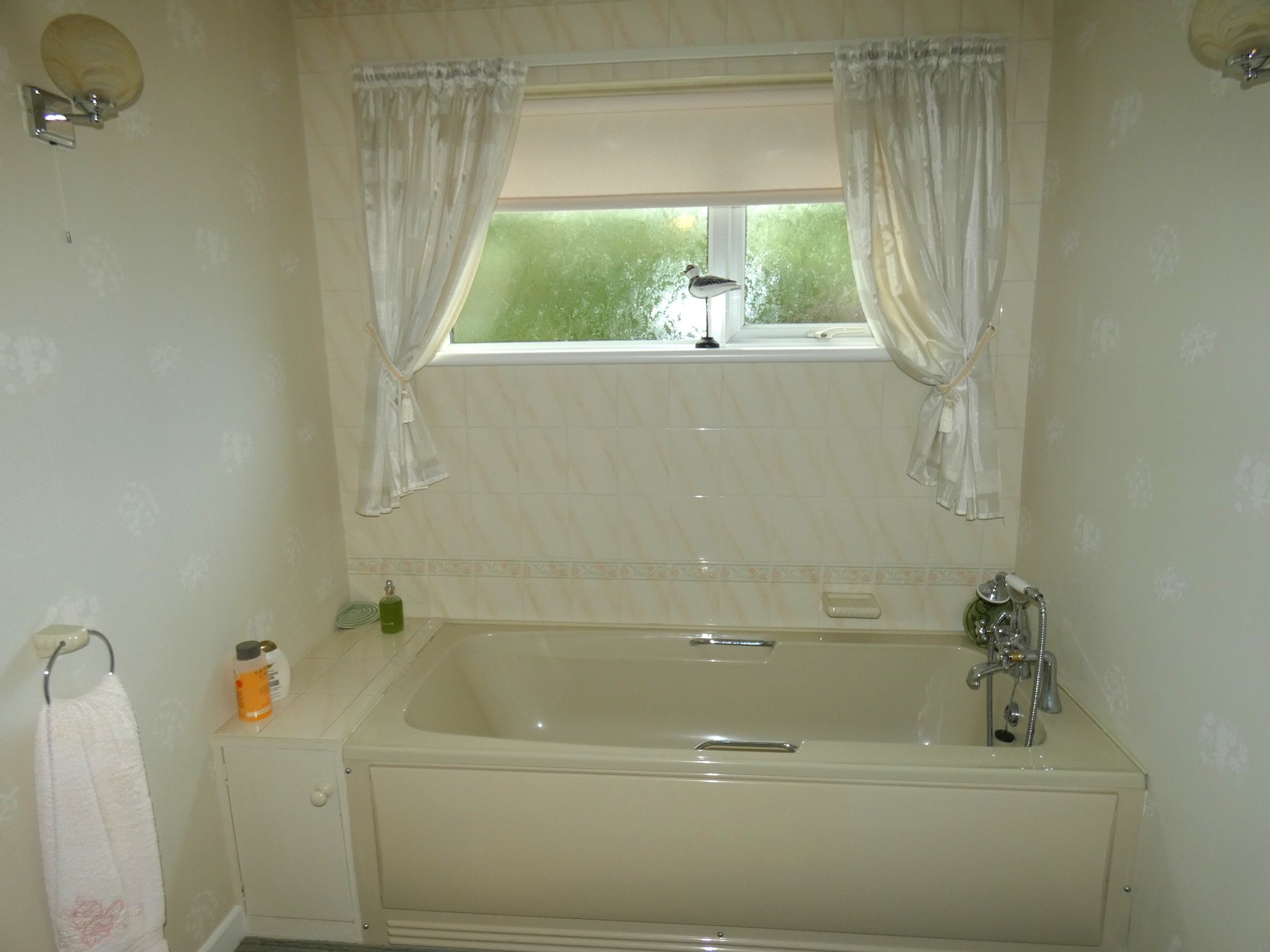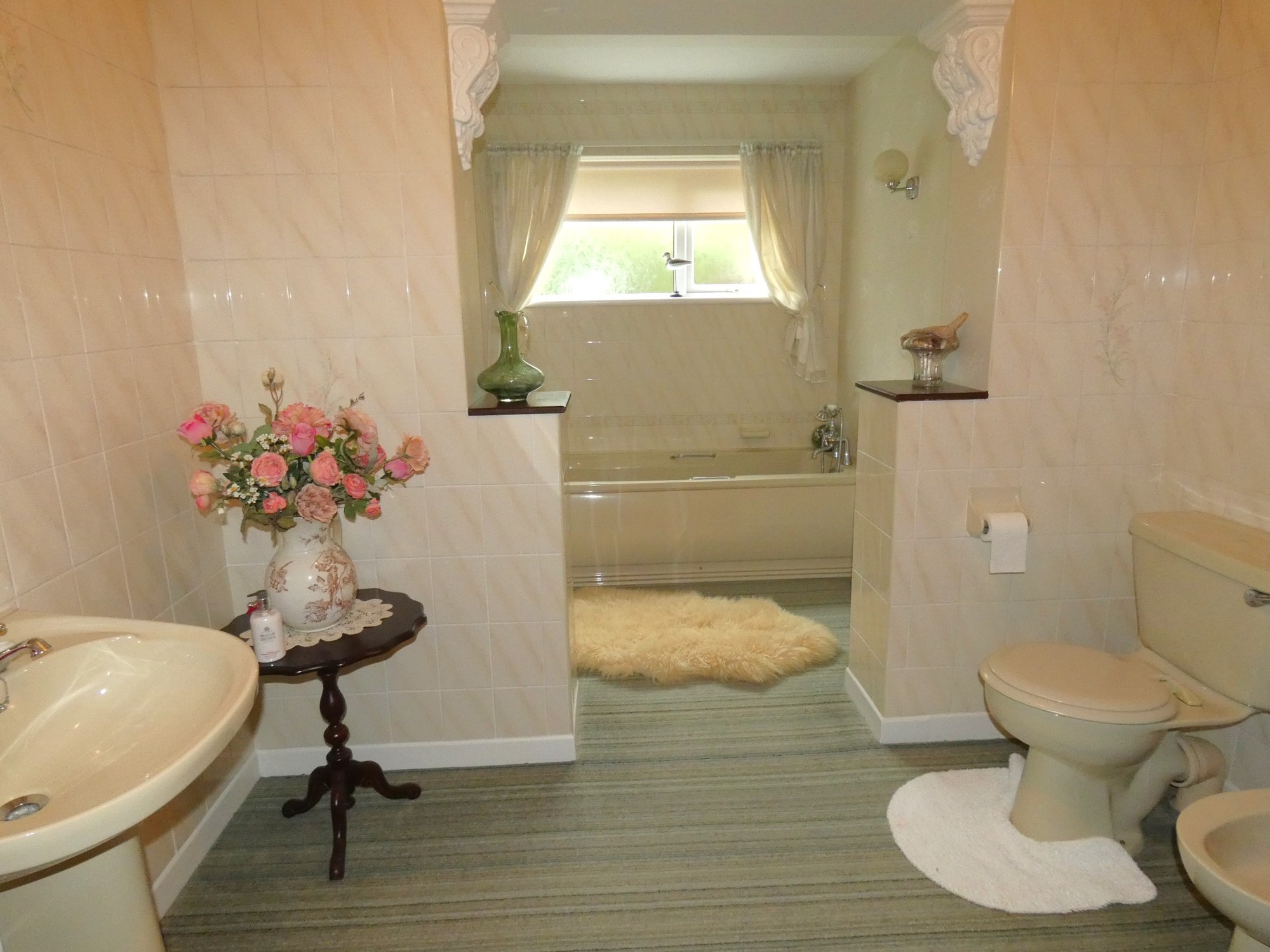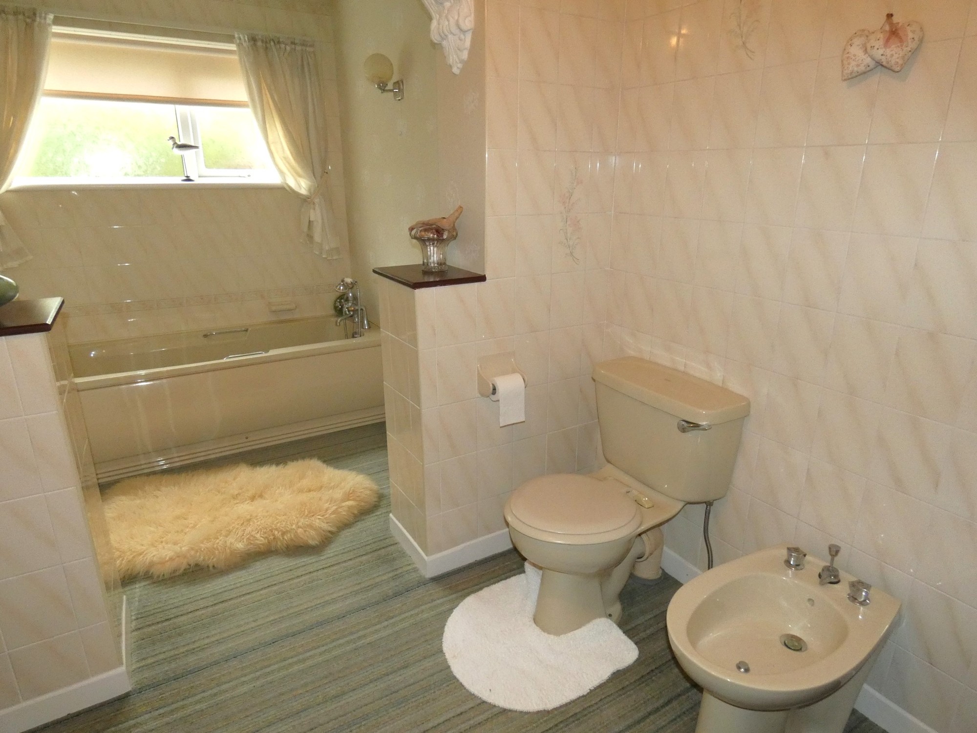 With fitted suite including bath with telephone hand shower, w.c, wash hand basin, bidet, part tiled walls, points for wall lights, access to roofspace storage.