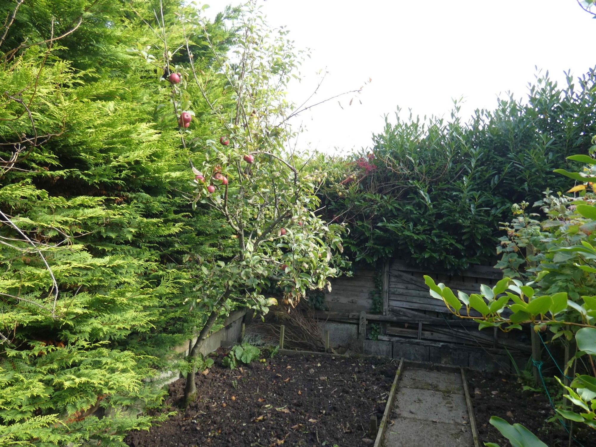 Raspberry canes, blackcurrant bushes, apple trees and rhubarb to rear garden area.