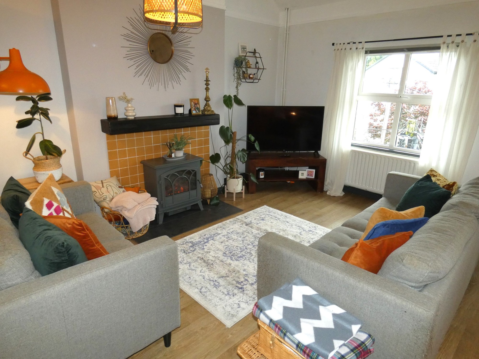 Decorative electrical stove with a tiled surround and overmantle, luxury vinyl LVT flooring, picture rail and the large windows providing a super outlook to the front.