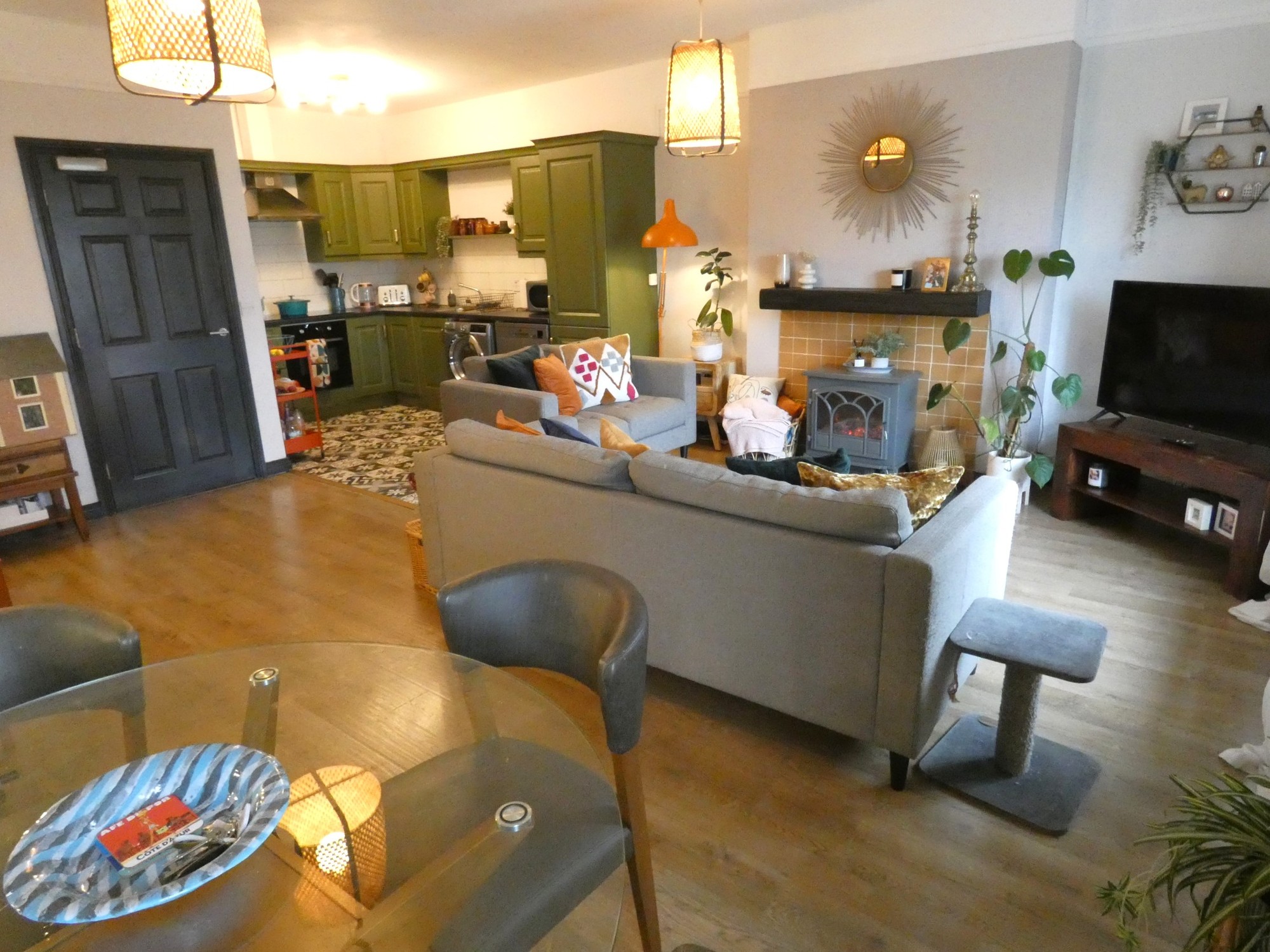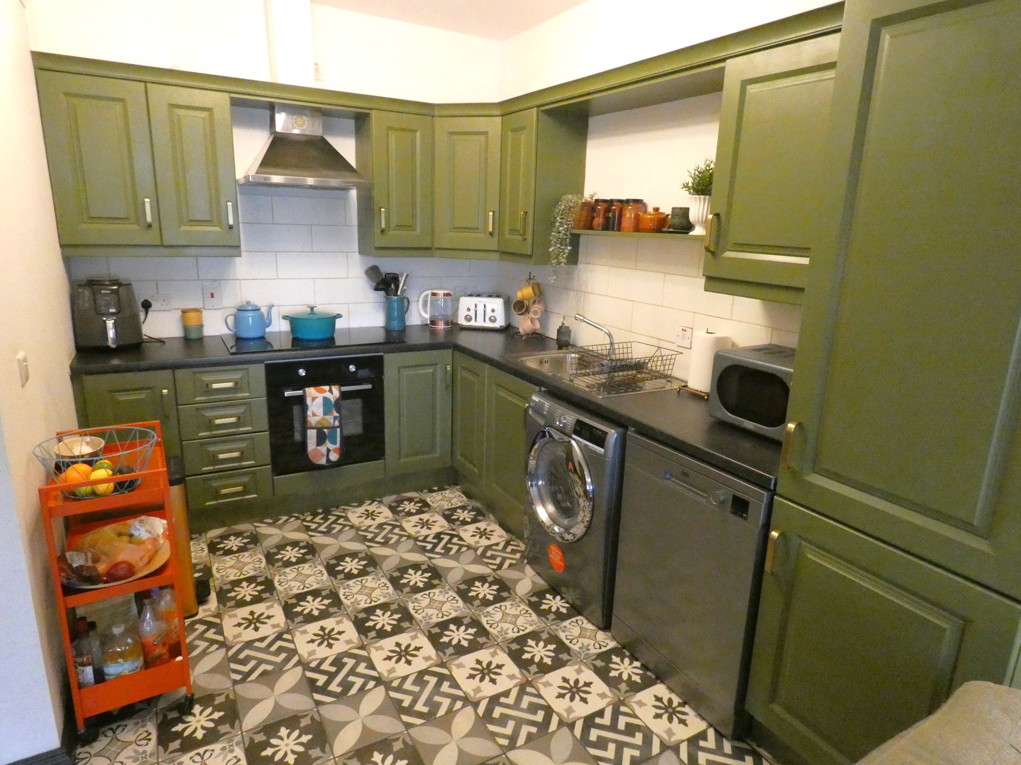 Kitchen with a range of painted finish eye and low level units, stainless steel sink, tiled between the worktop and the eye level units, large 5 ring ceramic hob, electric fan oven, stainless steel extractor fan over, integrated fridge freezer, plumbed for an automatic washing machine, tiled floor in the kitchen area and open plan to the living/dining area.