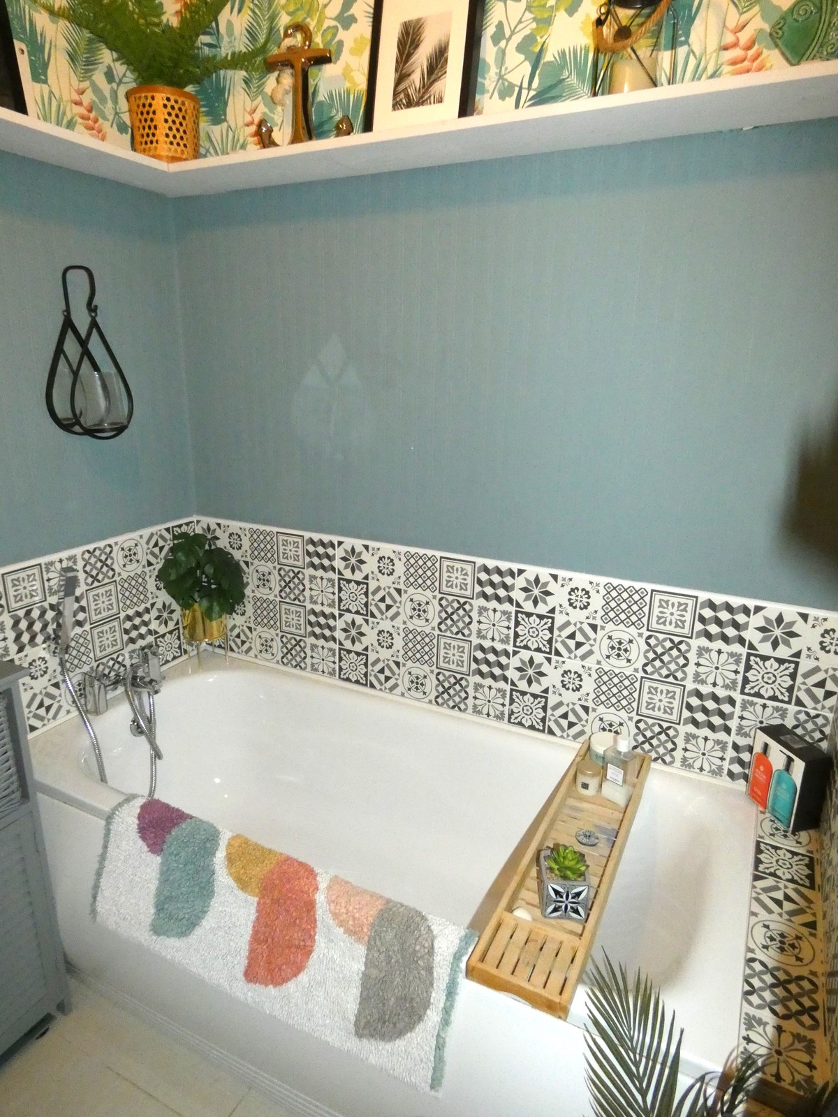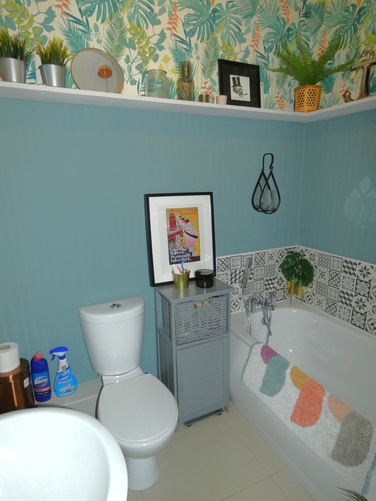 A luxury bathroom with a w.c, a pedestal wash hand basin with a tiled splashback, tiled floor, extractor fan and a panel bath with a telephone hand shower and a tiled splashback.