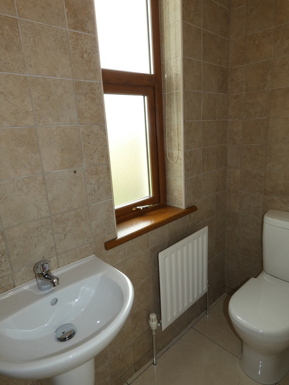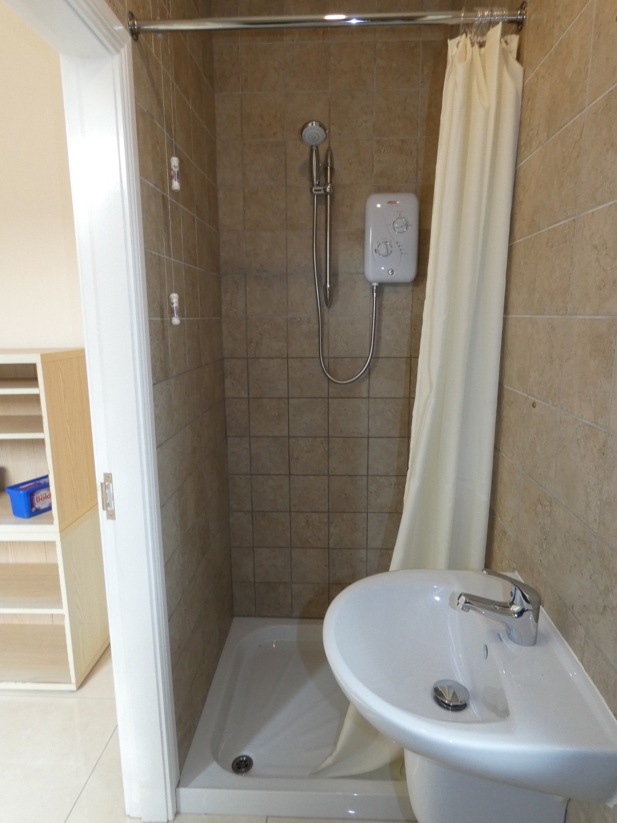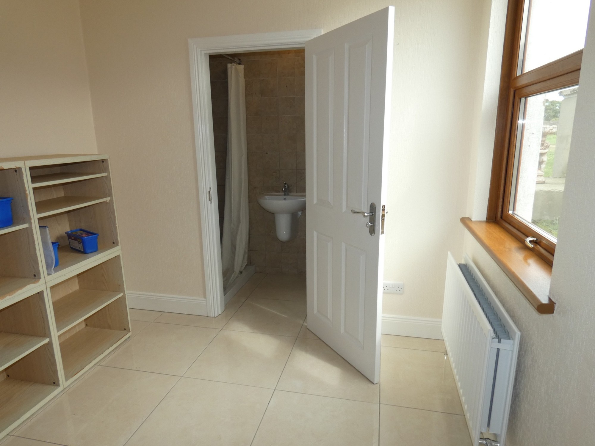With a tiled floor and an Ensuite shower room - with a w.c, a wall mounted wash hand basin, tiled walls, tiled floor and a tiled shower cubicle with a Redring electric shower.