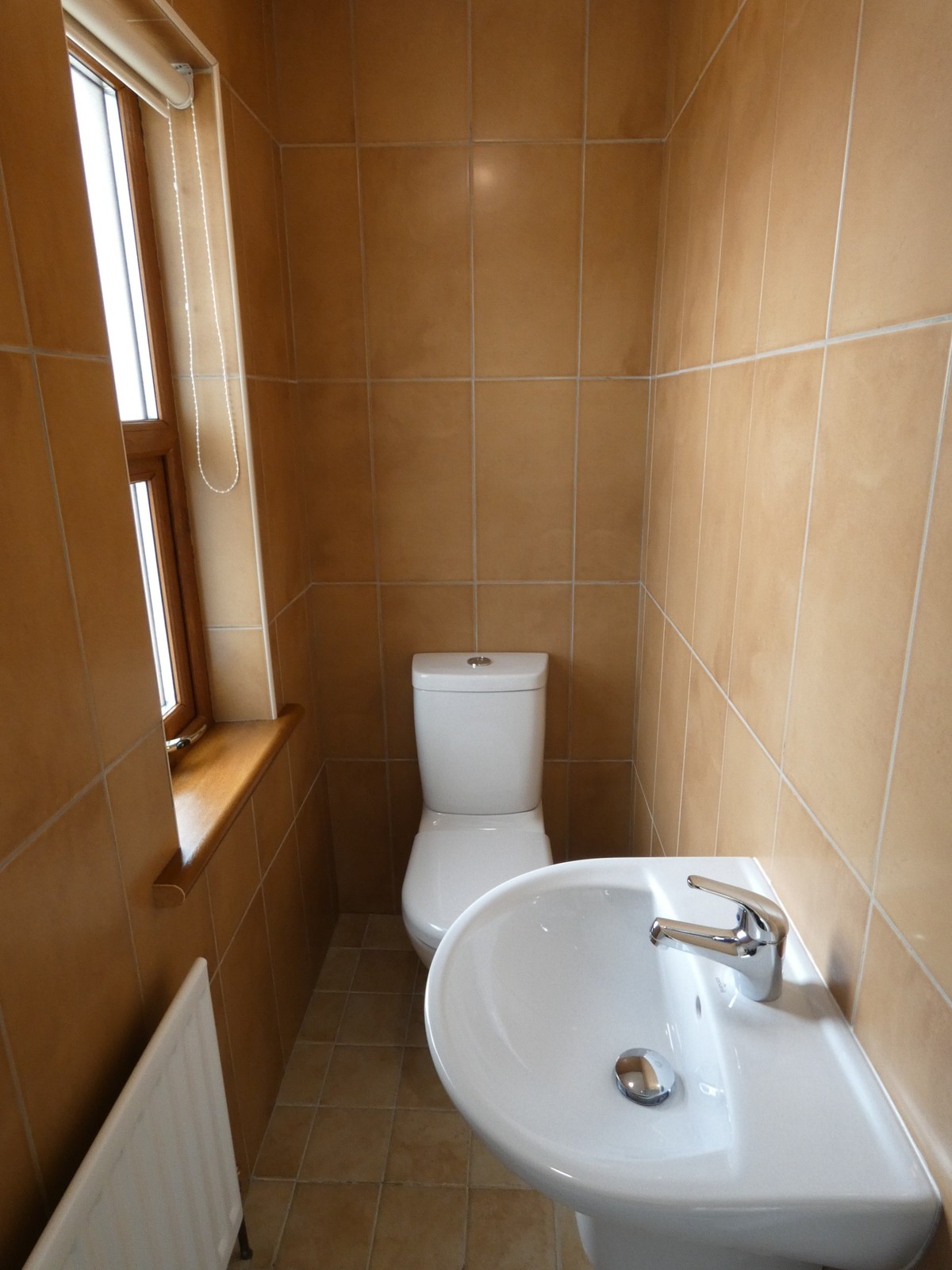 With a w.c, a wall mounted wash hand basin, tiled walls and a tiled floor.